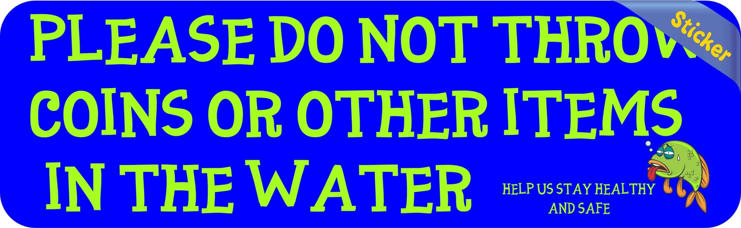 This sticker measures 10 inches wide by 3 inches tall. Keep your aquatic environments safe with this eye-catching safety reminder sticker. Featuring bold blue background with bright green text reading ‘PLEASE DO NOT THROW COINS OR OTHER ITEMS IN THE WATER’ accompanied by a colorful cartoon fish graphic and ‘HELP US STAY HEALTHY AND SAFE’ message. Ideal for aquariums, public fountains, fish ponds, pet stores, zoos, marine centers, and any water feature where visitor safety education is important. The vibrant colors and clear messaging ensure maximum visibility and compliance. Whether you’re managing a commercial aquarium or protecting your backyard koi pond, this professional-grade vinyl sticker delivers your safety message effectively while maintaining an attractive appearance that complements your aquatic display.