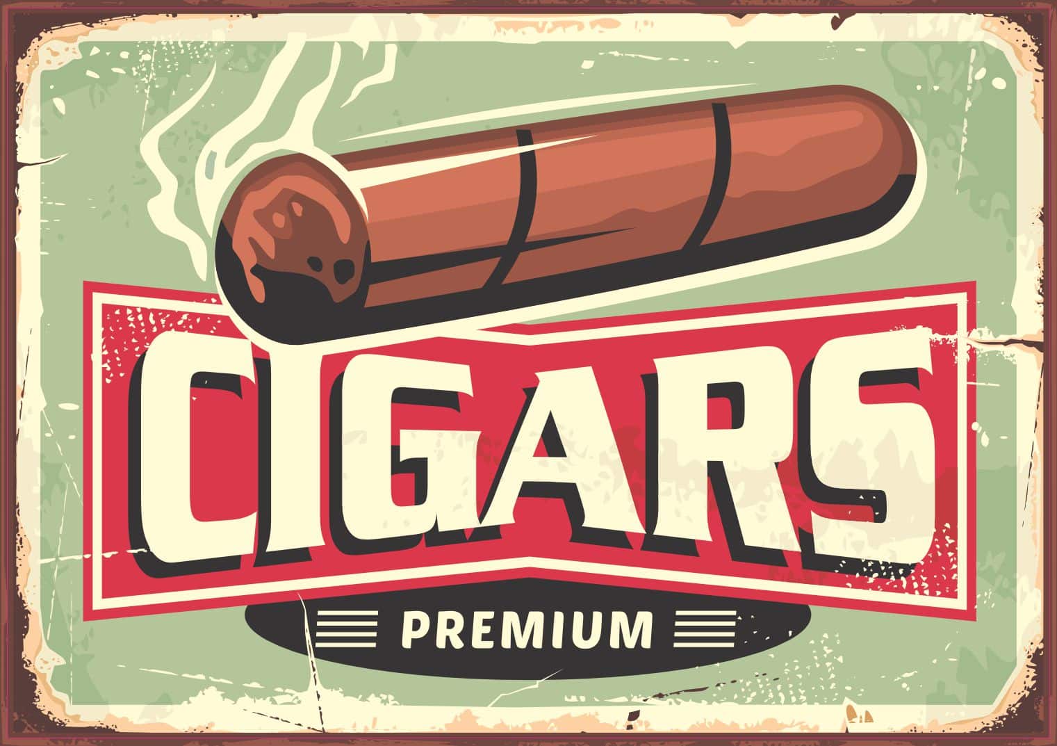 This sticker measures 5 inches wide by 3.5 inches tall. This vintage-inspired premium cigars vinyl sticker features a classic retro poster design with a detailed cigar illustration and bold red “CIGARS” text on a weathered green background. The design includes “PREMIUM” branding and authentic vintage styling with distressed edges for an authentic aged look. Perfect for adding vintage charm and humor to any smooth, clean surface.