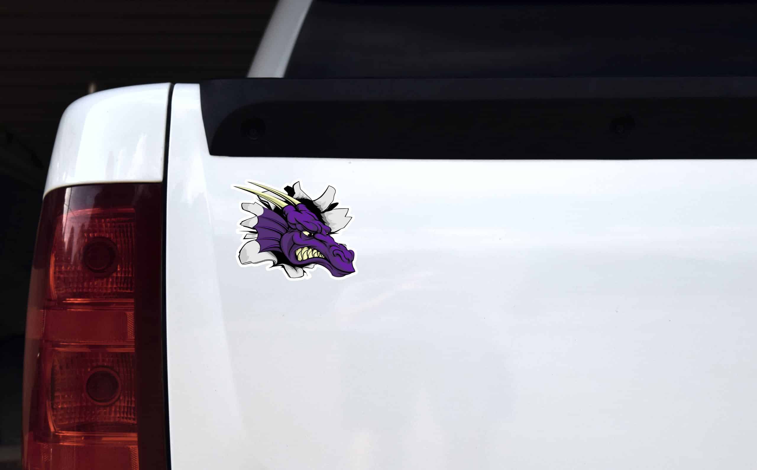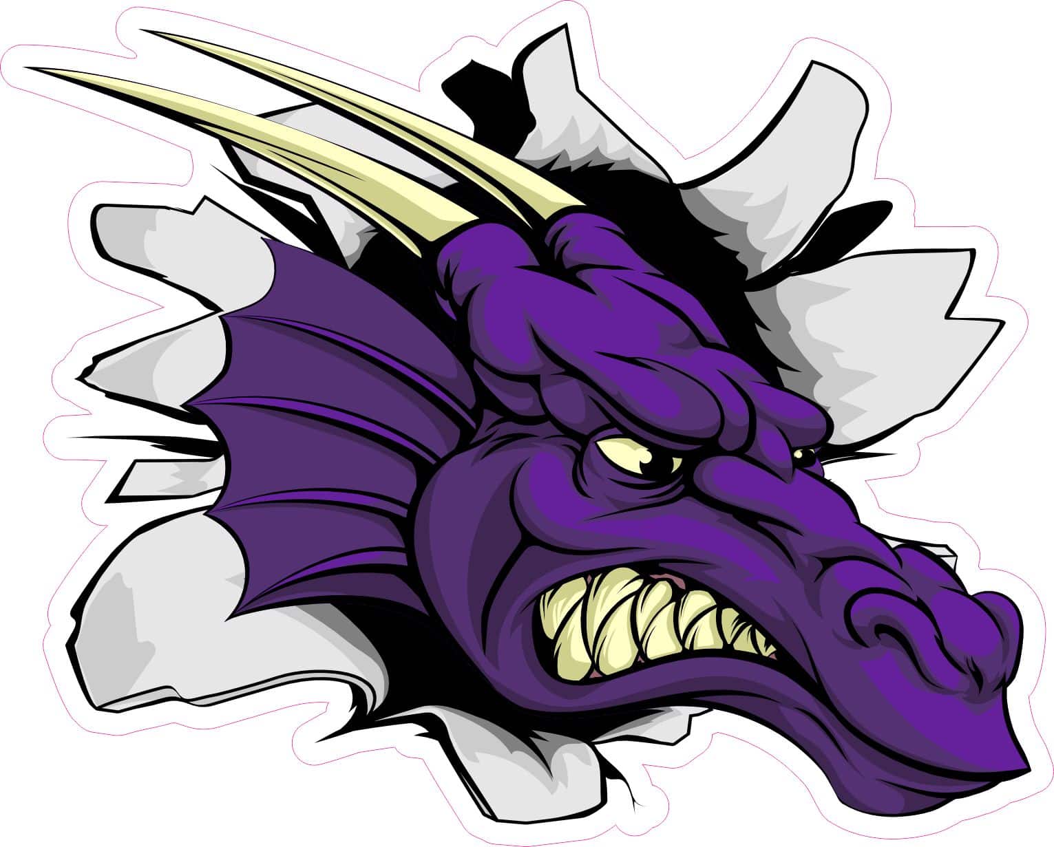 This sticker measures 5 inches wide by 4 inches tall. Show your fierce spirit with this bold purple dragon mascot vinyl sticker featuring a powerful dragon head with golden horns and teeth breaking through in dynamic style. The eye-catching design showcases vibrant purple scales, menacing yellow fangs, and an aggressive expression perfect for sports teams, gaming enthusiasts, or anyone who loves mythical creatures. This dragon sticker delivers professional quality and durability you can trust for personalizing laptops, water bottles, car windows, helmets, or any smooth surface.
