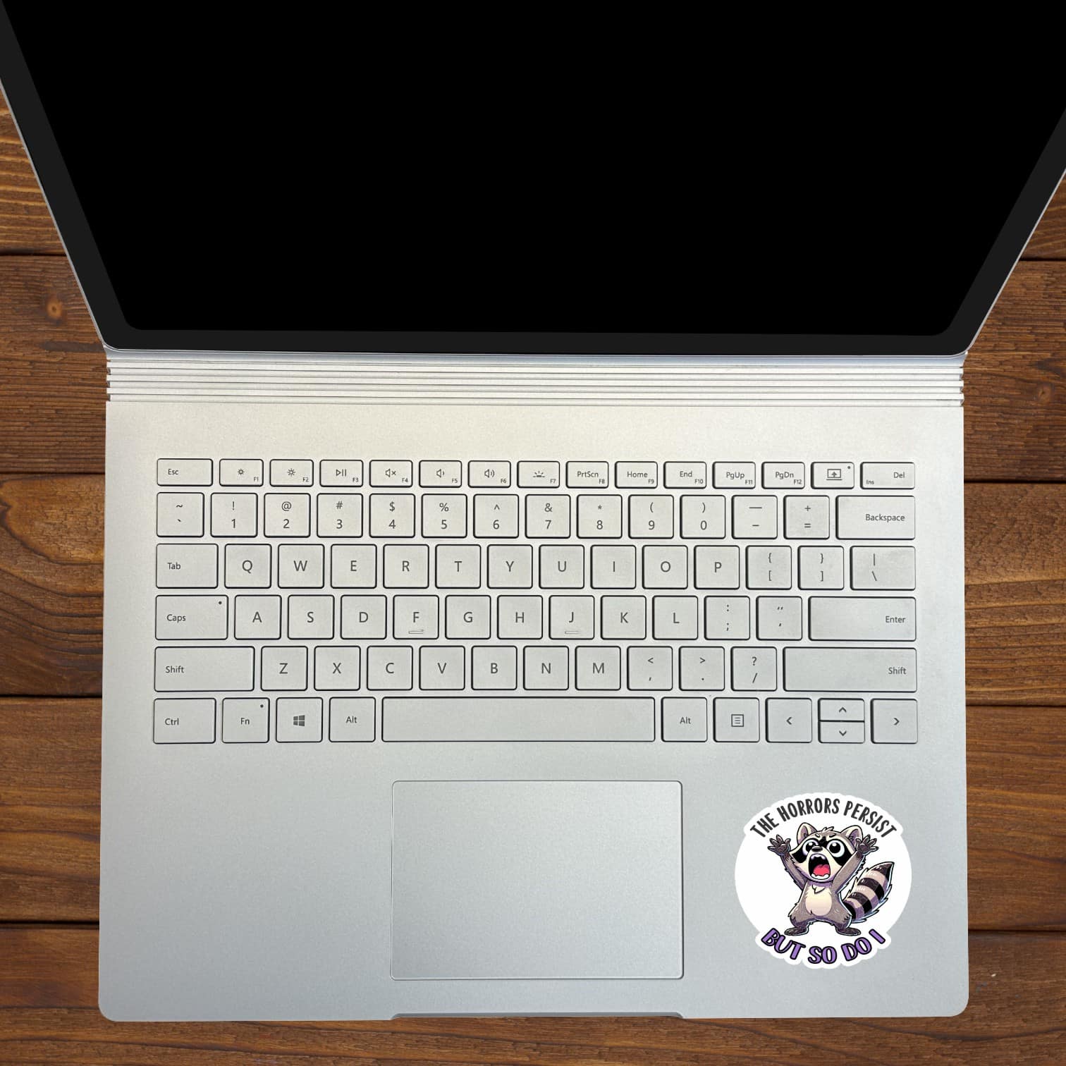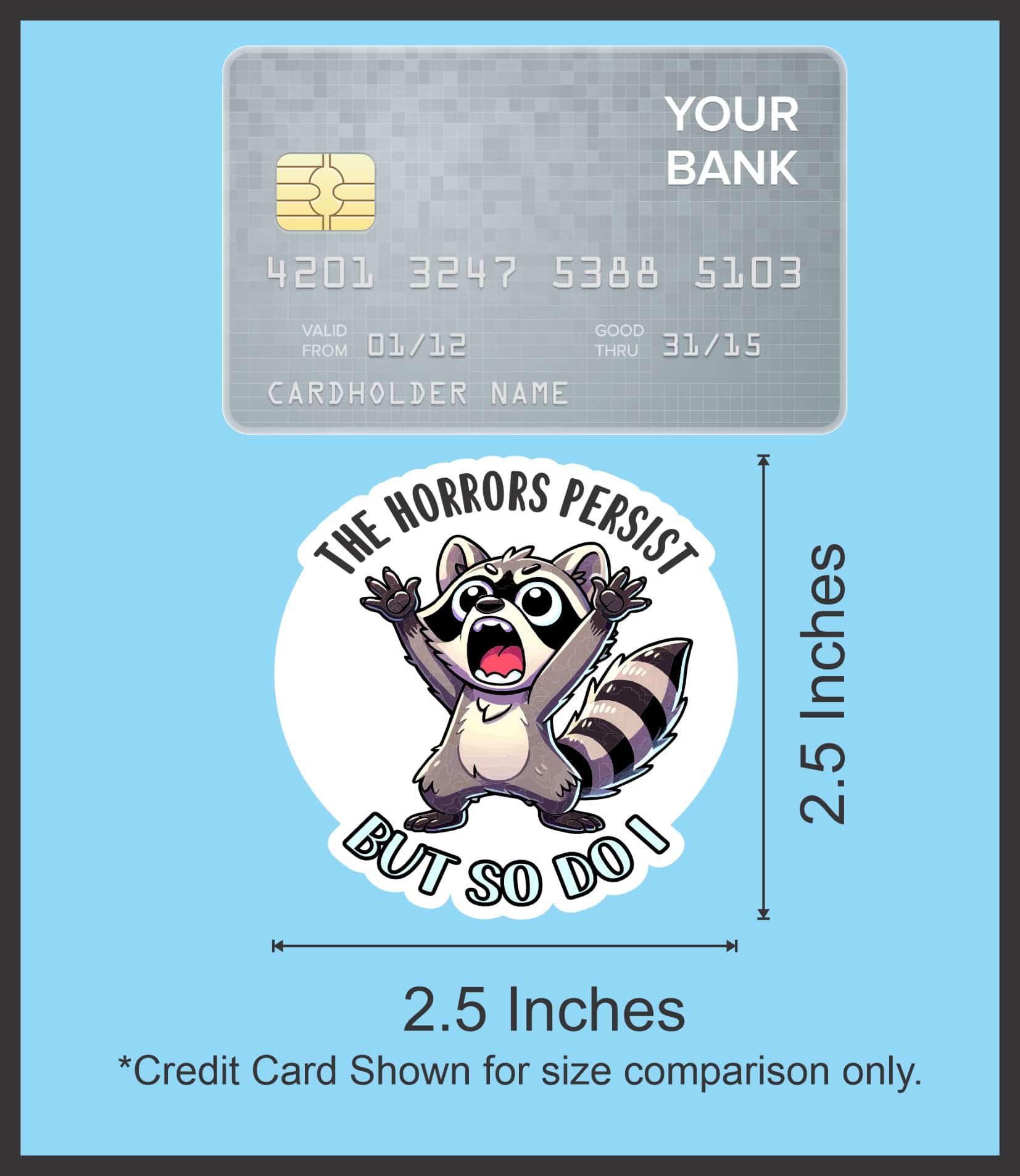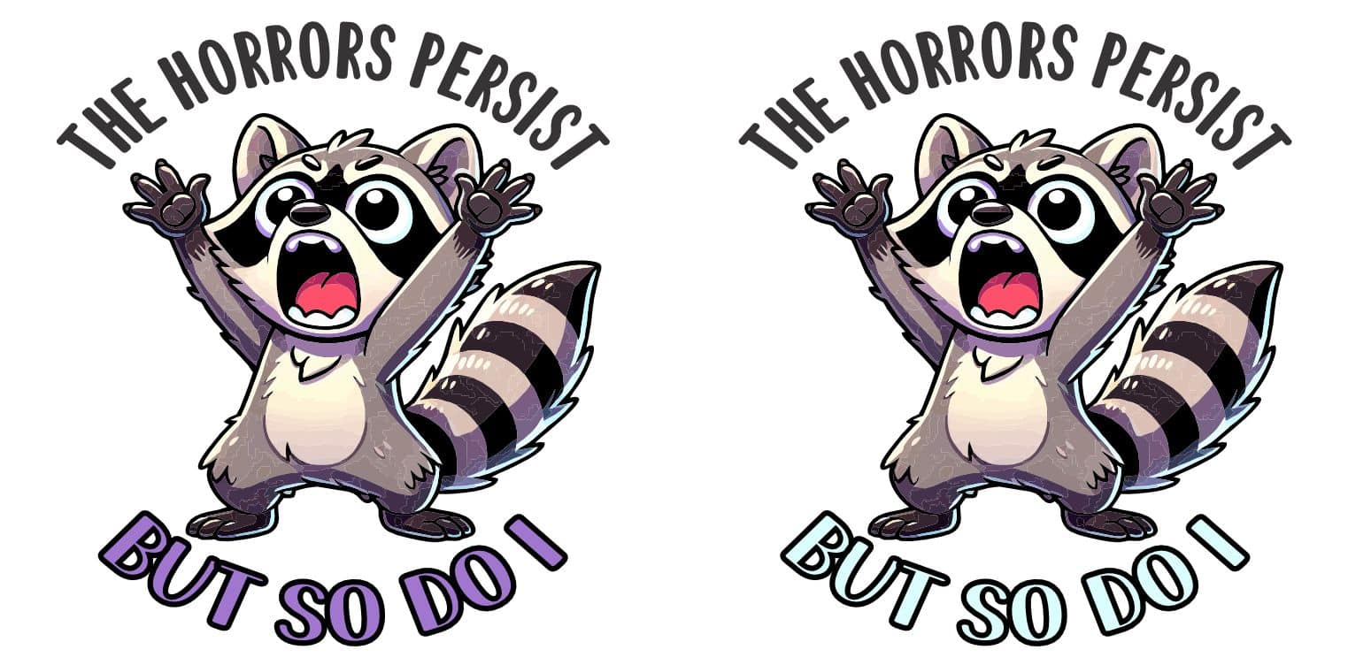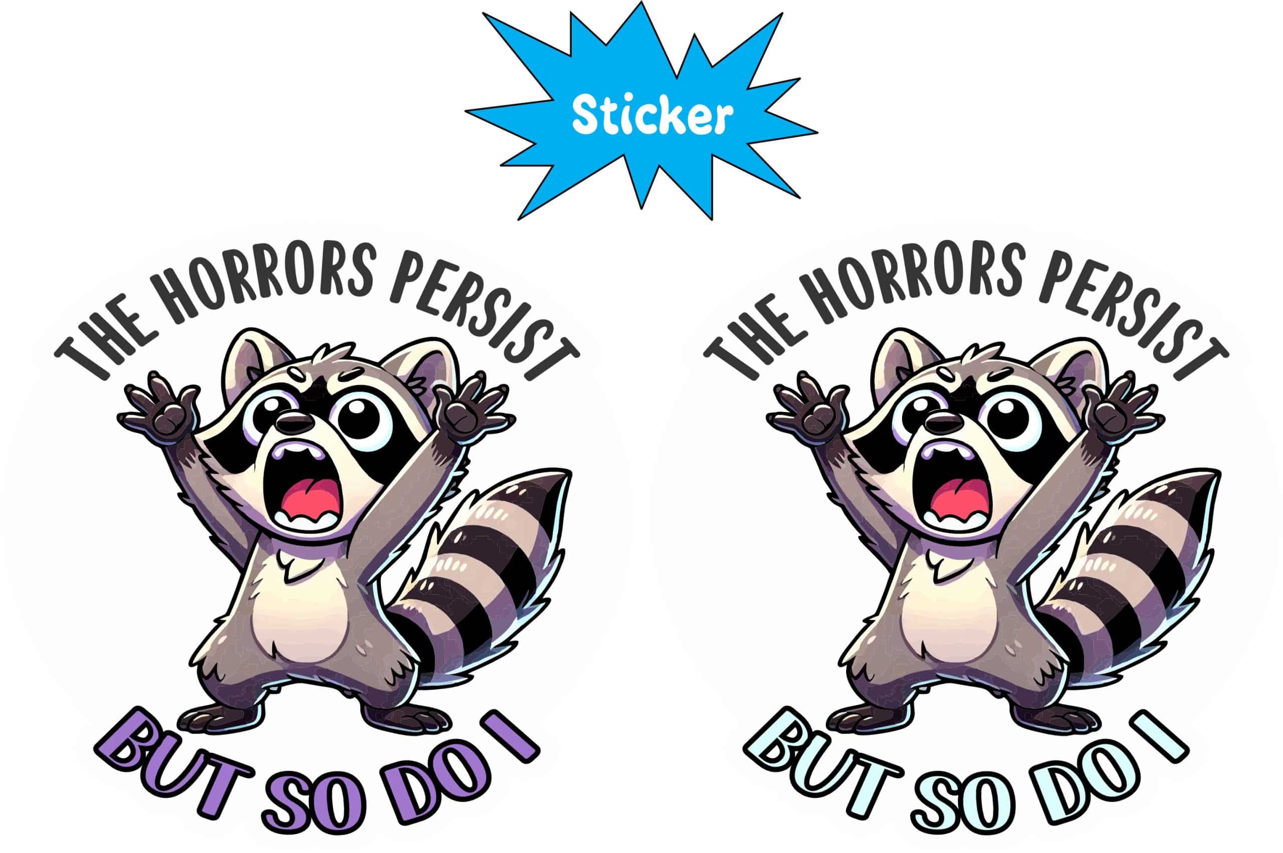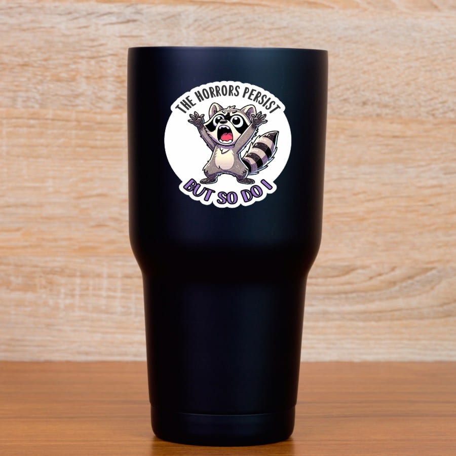 This is 1 sheet of 2 stickers, each measures 2.5 inches wide by 2.5 inches tall (63.5 mm x 63.5 mm). Each sticker shows an adorable raccoon throwing its hands wide and screaming, with the text THE HORRORS PERSIST BUT SO DO I, on the top and bottom of the sticker. Made from premium air release vinyl with standard removable adhesive, this sticker applies smoothly without bubbles and removes cleanly when needed. The high-quality construction features UV-resistant PVC lamination that protects against fading, cracking, and weather damage, making it perfect for both indoor and outdoor use. This humorous sticker is ideal for personalizing laptops, water bottles, phone cases, car bumpers, notebooks, and more. Waterproof and weatherproof construction ensures your sticker maintains its bright appearance through rain, sun, and daily wear. Proudly made in the USA with attention to quality and detail. The removable adhesive allows for easy application and clean removal, though each sticker is designed for one-time use.