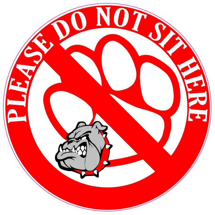 This circular sticker is 3 inches wide by 3 inches tall when applied.  It depicts a red and white paw print and a gray bulldog mascot emblem wearing a spiked, red collar.  A red circle and slash containing the words, PLEASE DO NOT SIT HERE, in white letters is printed over the paw print and bulldog.  The pink line in the image shows where the sticker is cut; the pink line is not printed on the sticker.  This carefully crafted product is a great way to enforce social distancing guidelines while promoting school spirit!