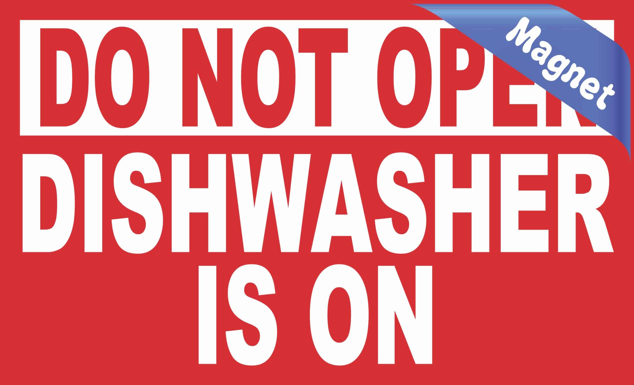 This magnet measures 5 inches wide and 3 tall. At the top of the magnet there is a white banner with red text that says “DO NOT OPEN”. Below that the rest of the magnet has a red background with white text that says “DISHWASHER IS ON”. This magnet serves as a helpful reminder to not open the dishwasher while it’s in use. Perfect for both commercial and residential use. It works best when applied to any flat smooth magnetic surface. The pink line indicates where the magnet will be cut and will not be printed on the final product.