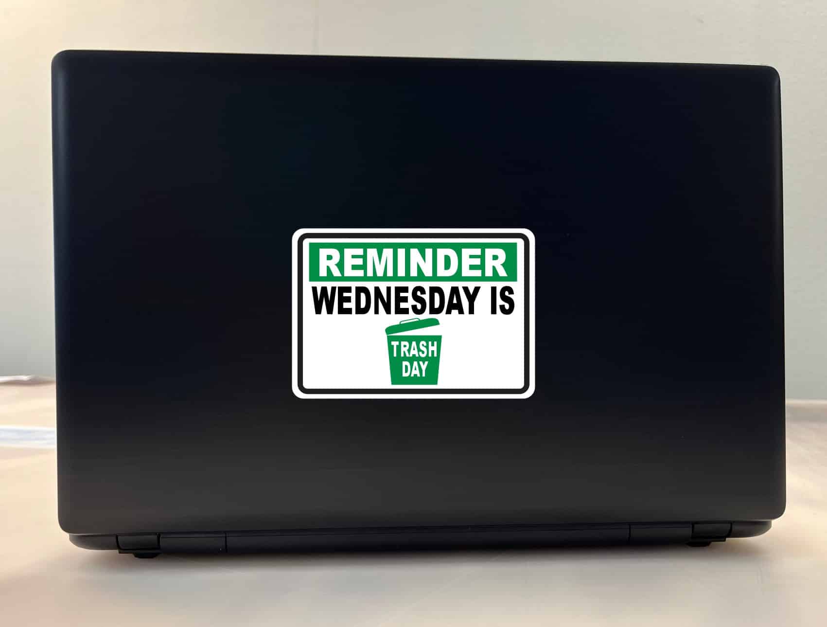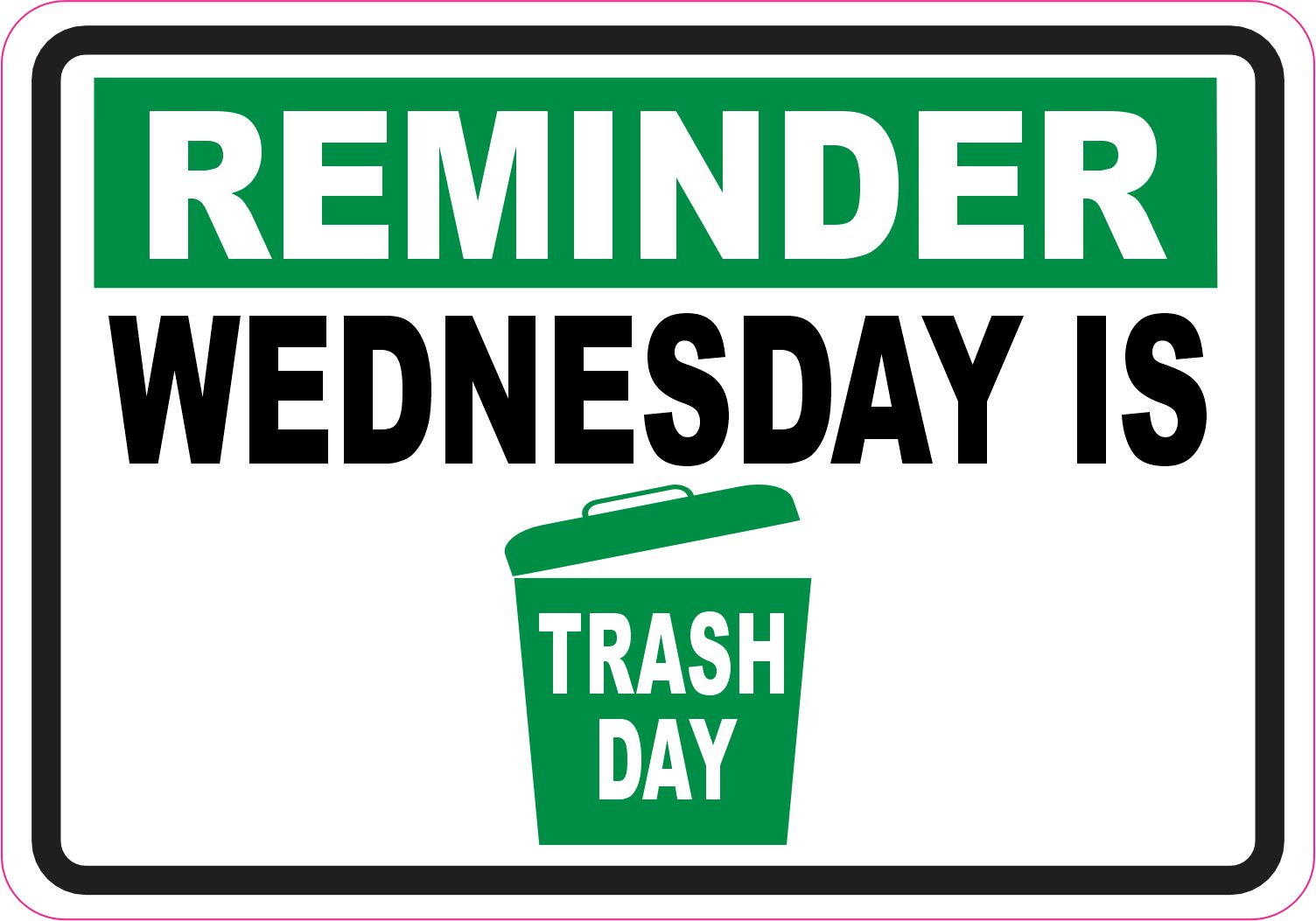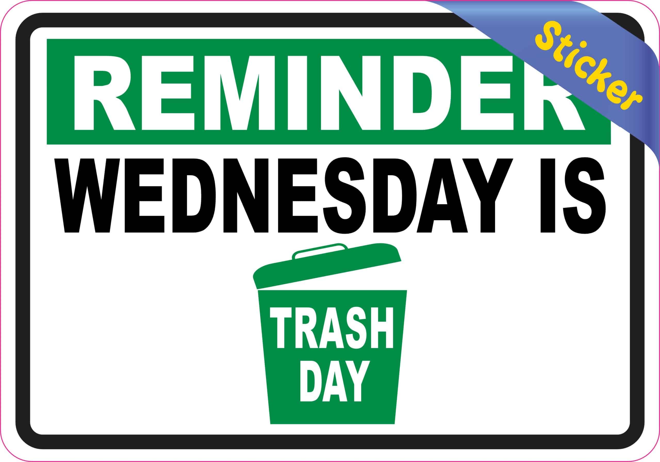 This sticker measures 5 inches wide by 3.5 inches tall (127.0 mm x 88.9 mm). Never miss trash day again with this eye-catching reminder sticker featuring bold white text on a vibrant green background. The design includes a green trash can icon and clear messaging to help you remember your weekly collection schedule.