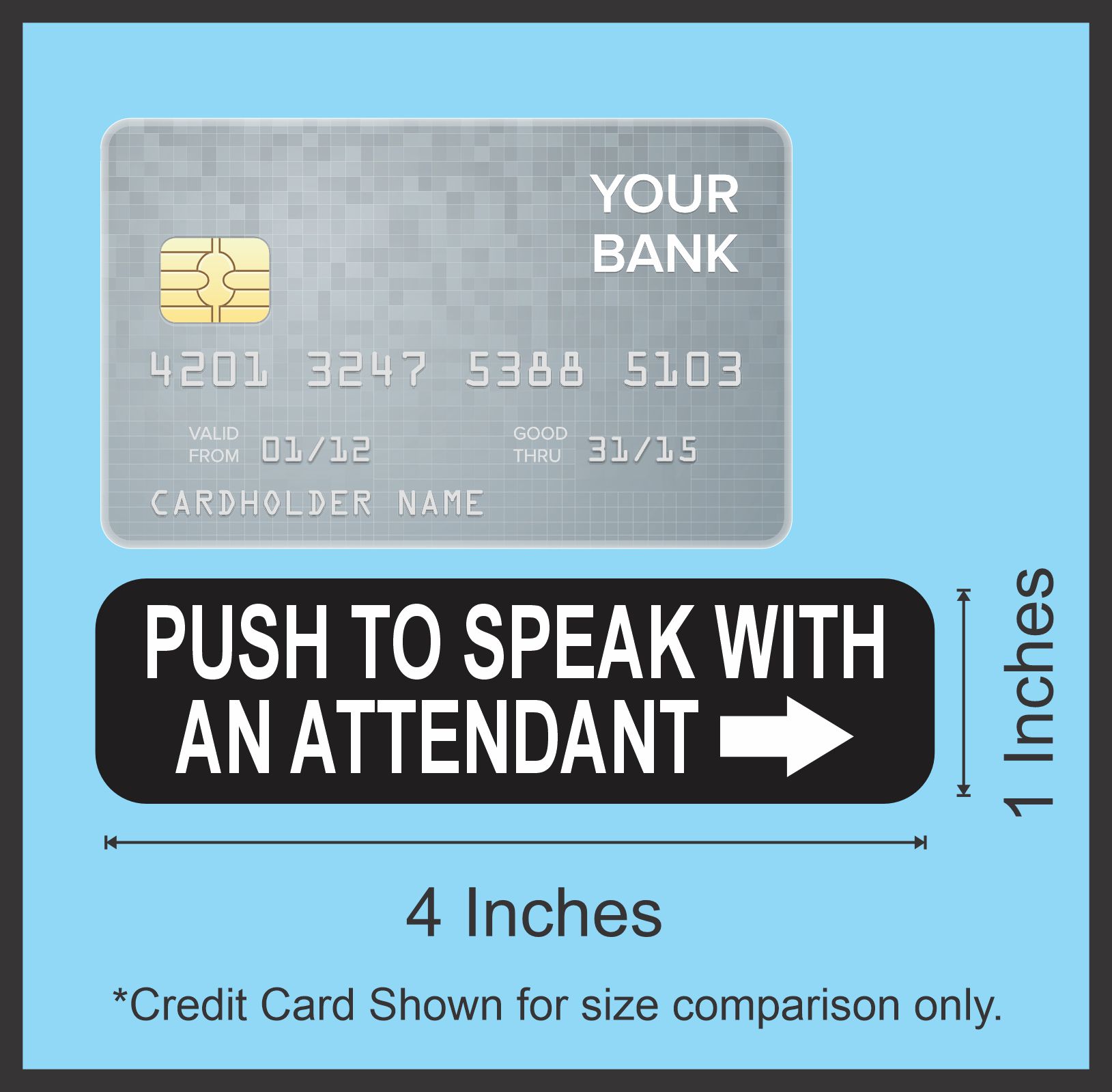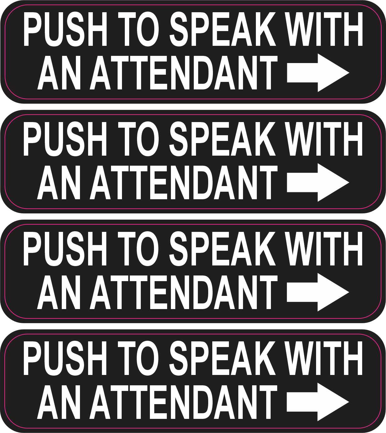 his is 1 sheet of 4 stickers. Each sticker measures 4 inches wide and 1 inch tall. These stickers have a black background with white text that says, PUSH TO SPEAK WITH AN ATTENDANT, with a right pointing arrow. These stickers are easy to read! They can be applied to any flat smooth surface. The pink line indicates where the stickers will be cut and will not be printed on the final product.