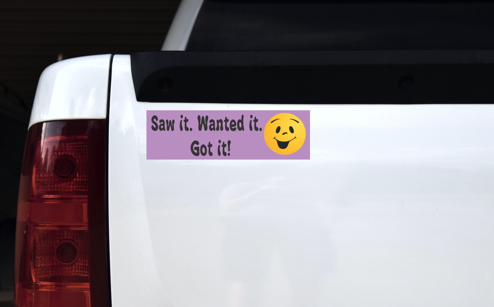 This bumper magnet is 10 inches wide by 3 inches tall when applied. It features the words, Saw it. Wanted it. Got it., in black letters on a purple background. A yellow happy face is printed on the right side of the text. This quality-made product is a witty way to express yourself! However, it only attracts ferromagnetic metals.