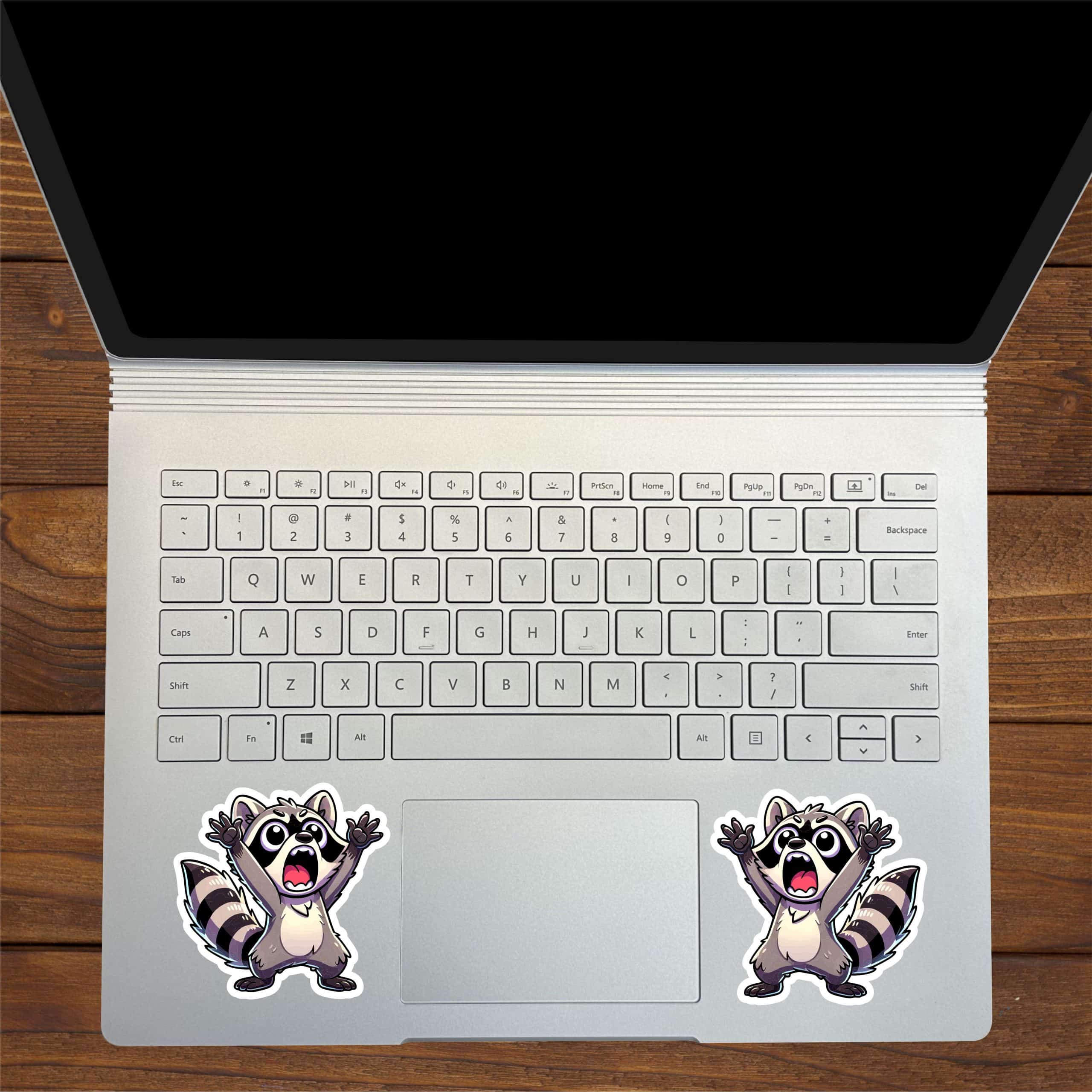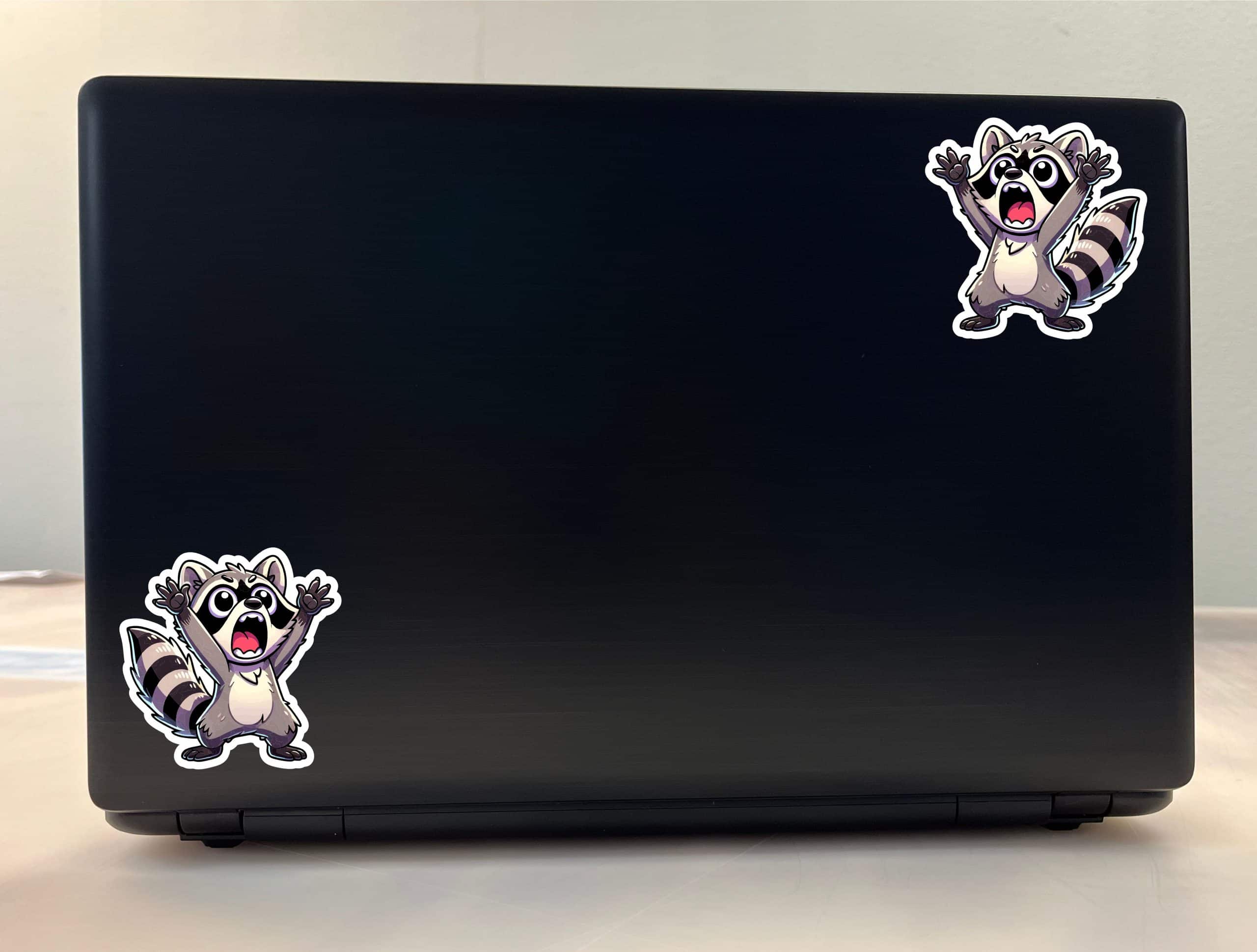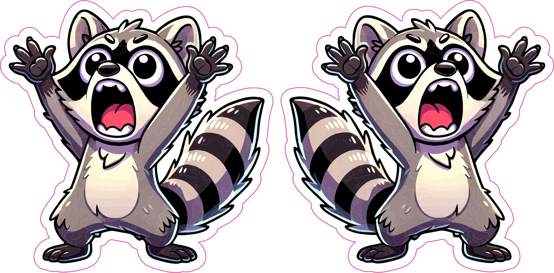 This is 1 sheet of 2 stickers, each one measures 3 inches wide by 3 inches tall (76.2 mm x 76.2 mm). These delightfully animated raccoon stickers feature screaming cartoon characters with their arms raised in celebration, showcasing the classic raccoon black mask markings, striped tails, and scared expressions with pink tongues showing. Perfect for adding humor and personality to any surface.