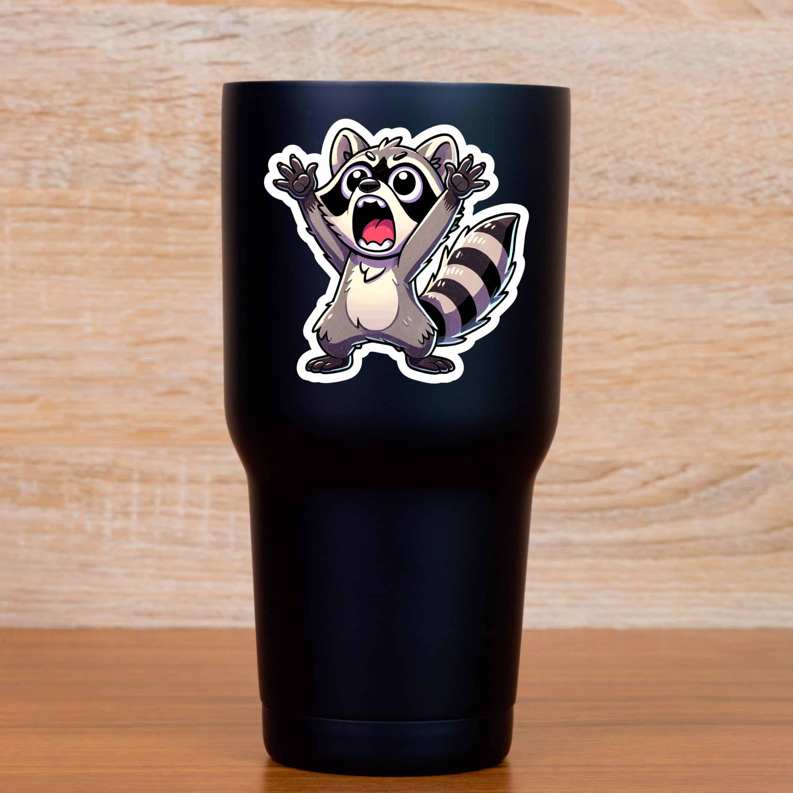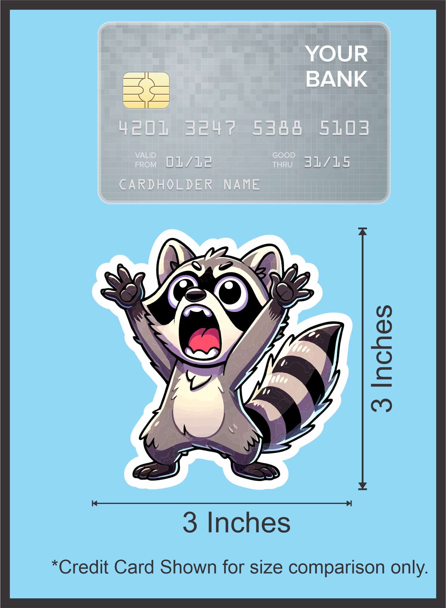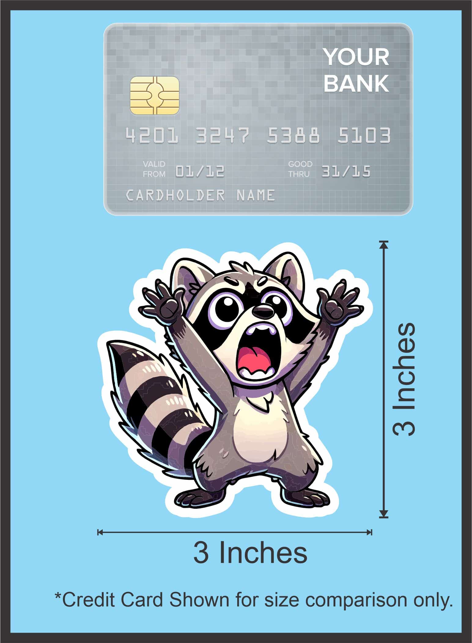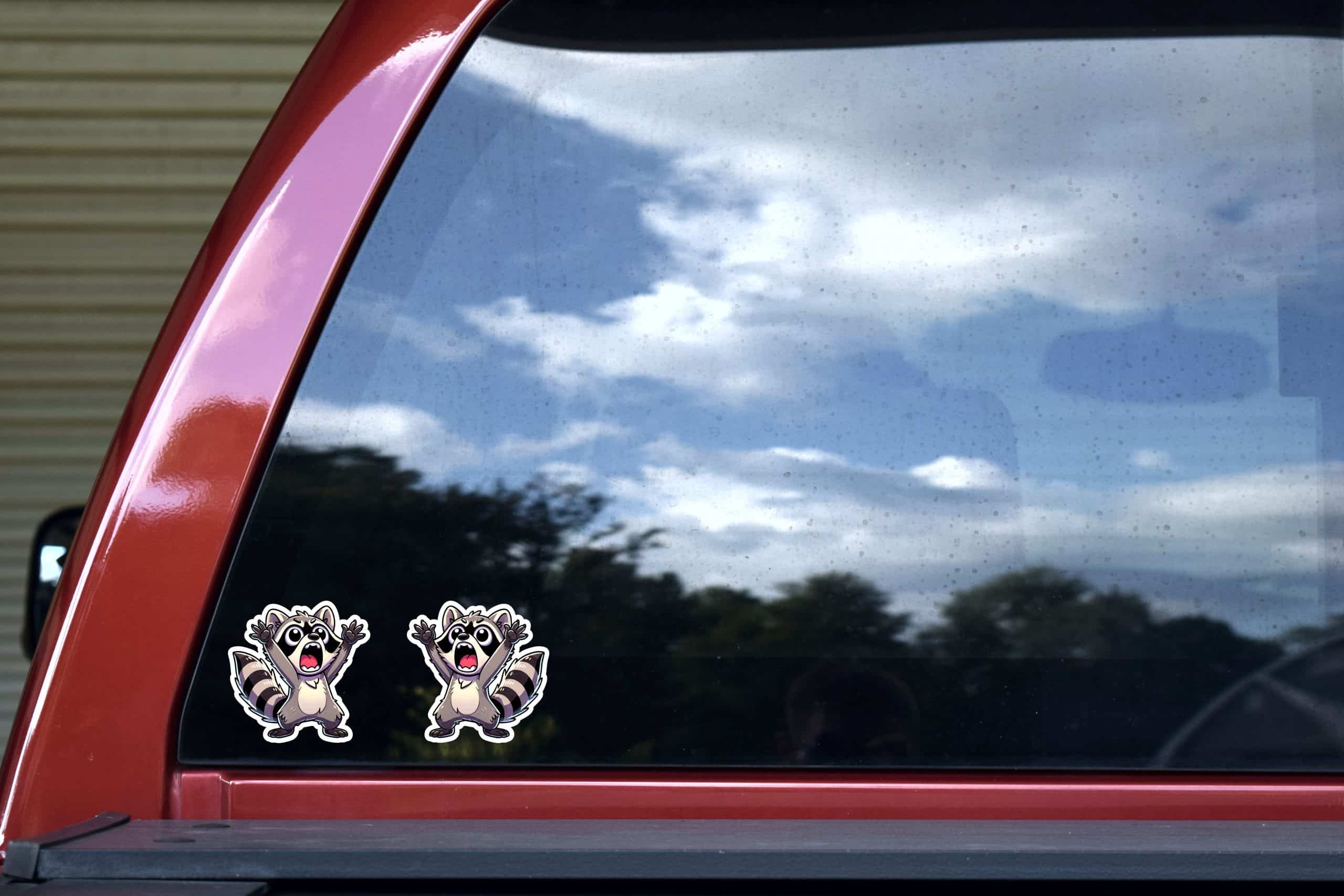 This is 1 sheet of 2 stickers, each one measures 3 inches wide by 3 inches tall (76.2 mm x 76.2 mm). These delightfully animated raccoon stickers feature screaming cartoon characters with their arms raised in celebration, showcasing the classic raccoon black mask markings, striped tails, and scared expressions with pink tongues showing. Perfect for adding humor and personality to any surface.