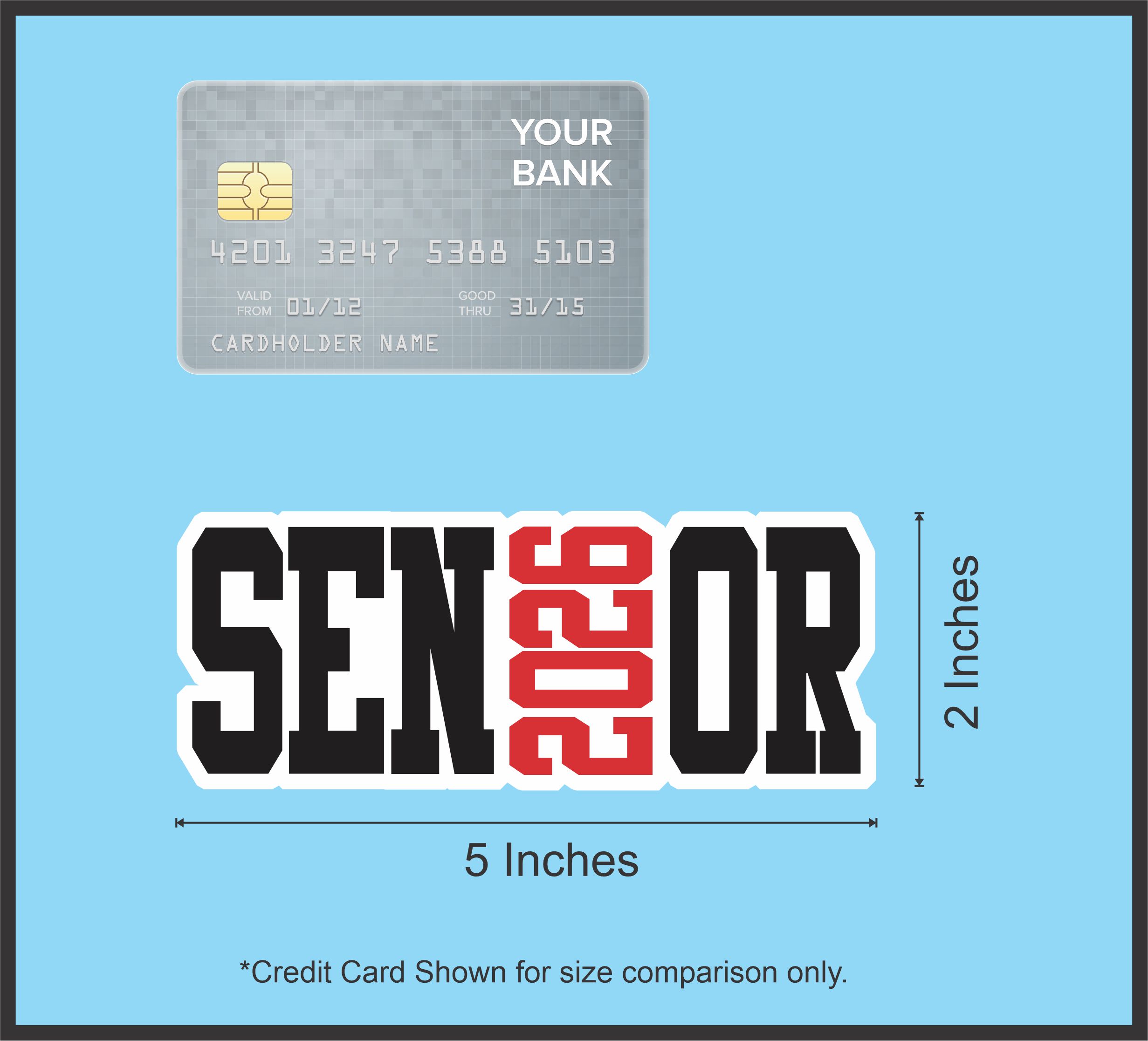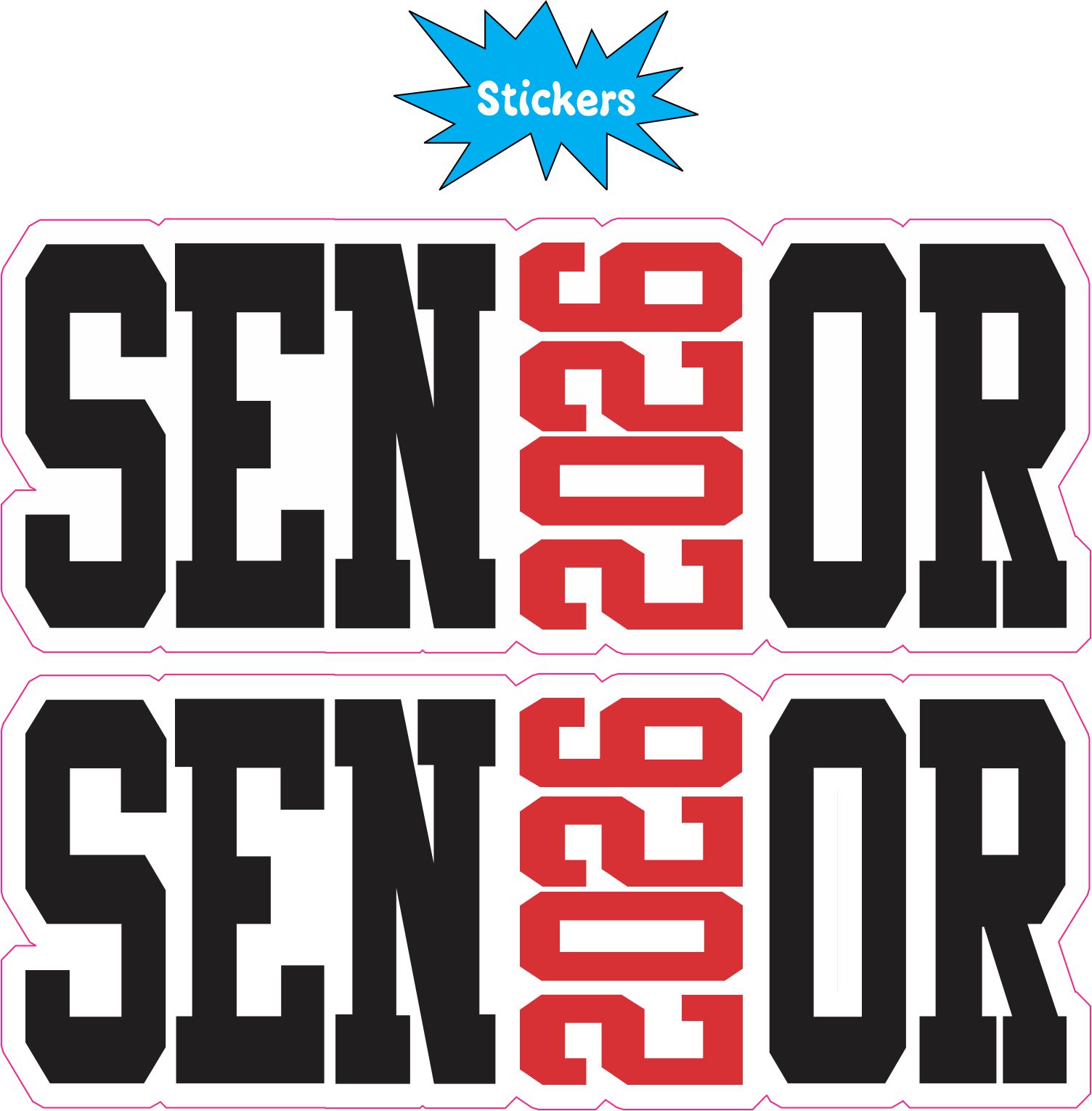 This is 1 sheet of 2 stickers. Each sticker measures 5 inches wide and 2 inches tall. These cool stickers have a white background with black text Senior 2026 and the 2026 is in place of the I in Senior which is red. These are awesome for showing school pride and celebrating being a senior. They look amazing on laptops, coffee cups, or any other flat smooth surface. The pink line indicates where the stickers will be cut and will not be printed on the final product.