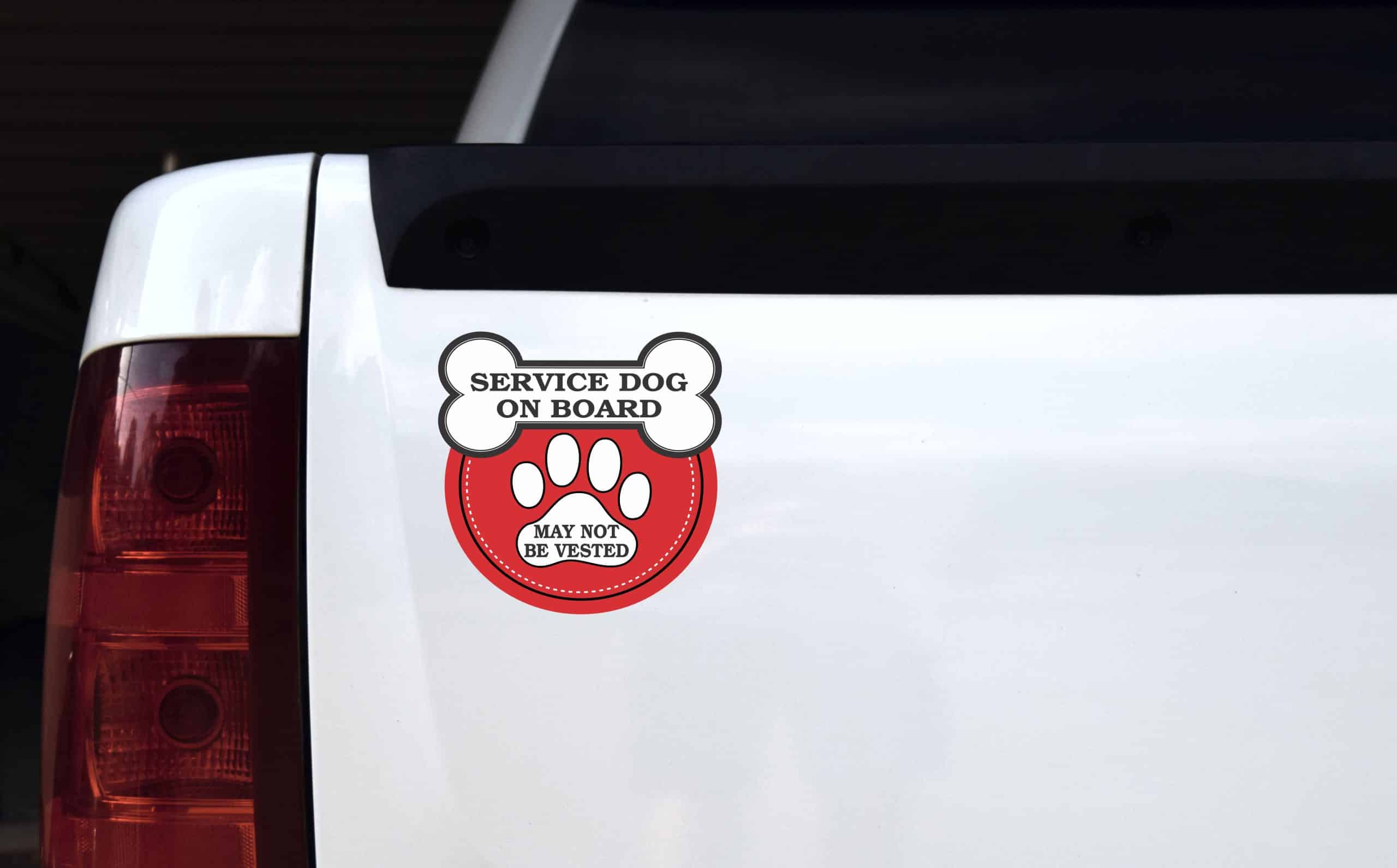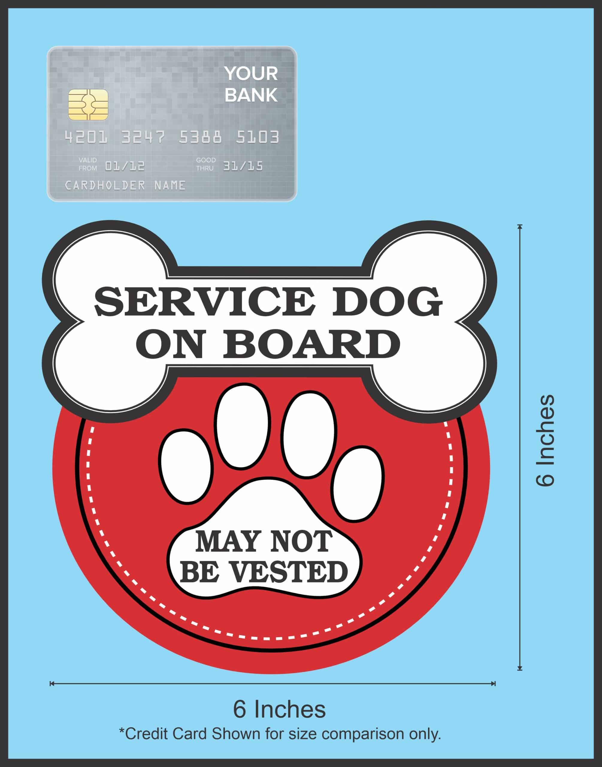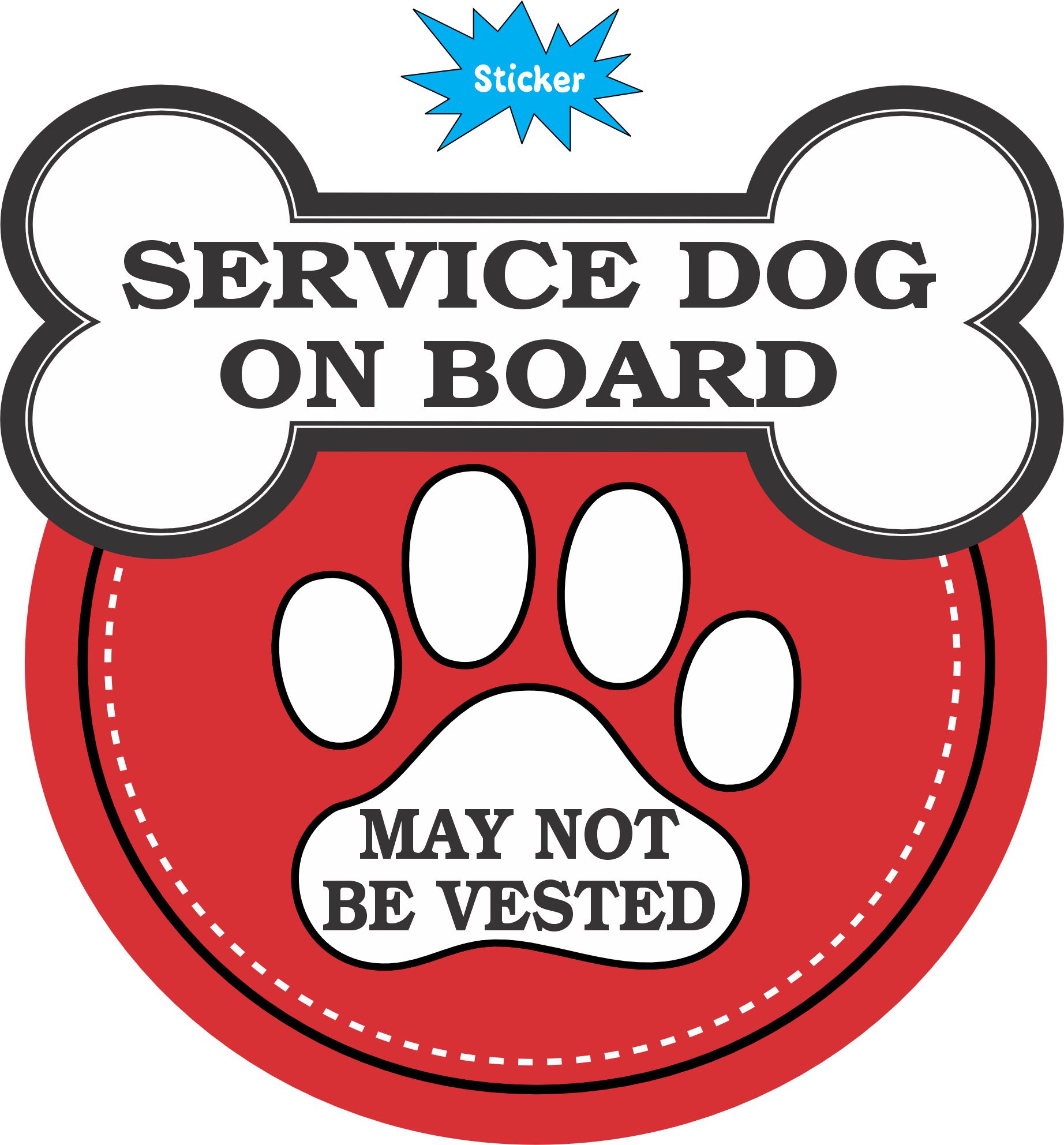 This sticker measures 6 inches wide and 6 inches tall. In black text it says, SERVICE DOG ON BOARD MAY NOT BE VESTED. This sticker has a fun dog bone design at the top of it and paw print design in the middle. This sticker is great for making others aware of a service dog on board. It can be applied to any flat smooth surface. The pink line indicates where the sticker will be cut and will not be printed on the final product.