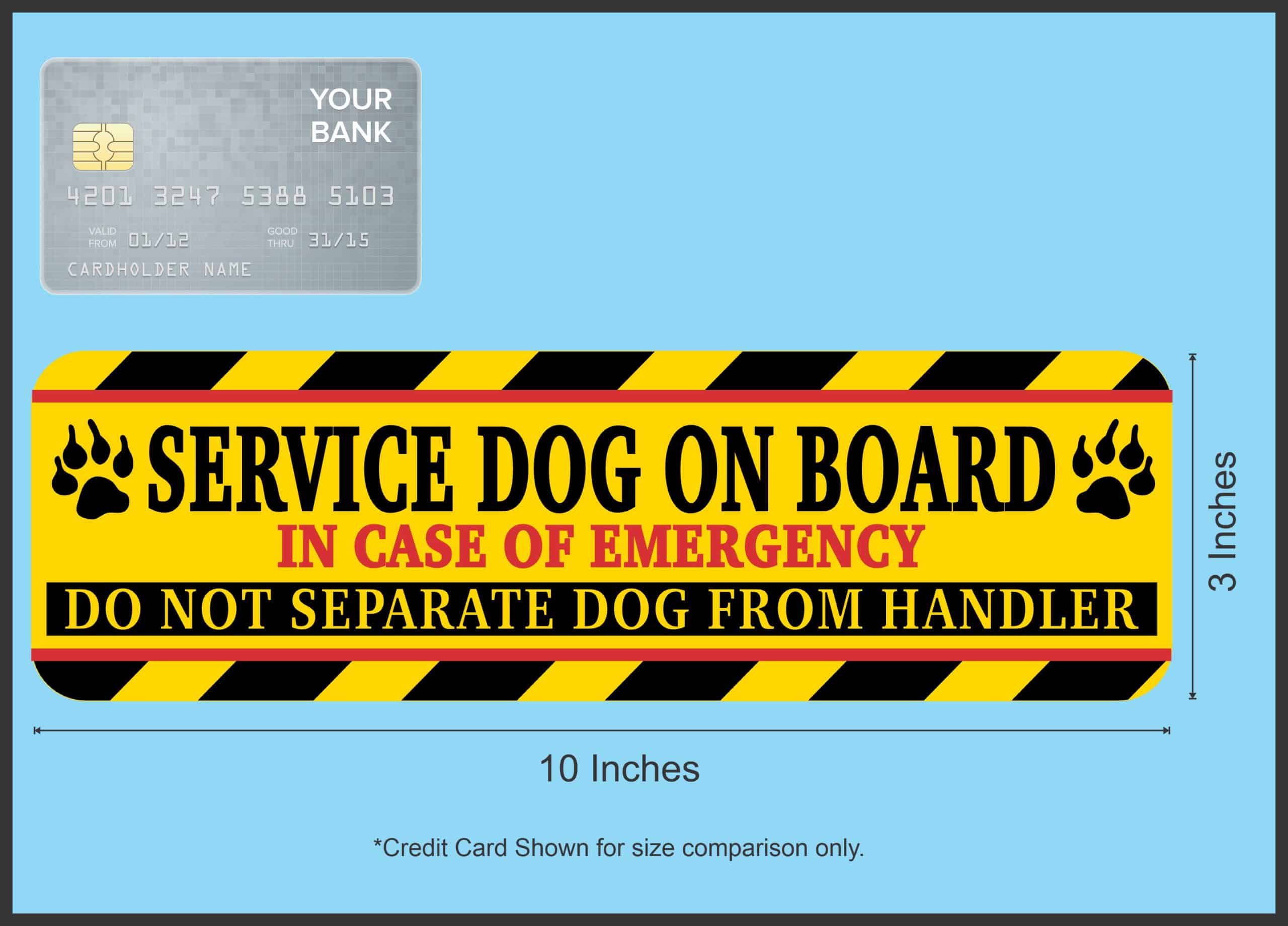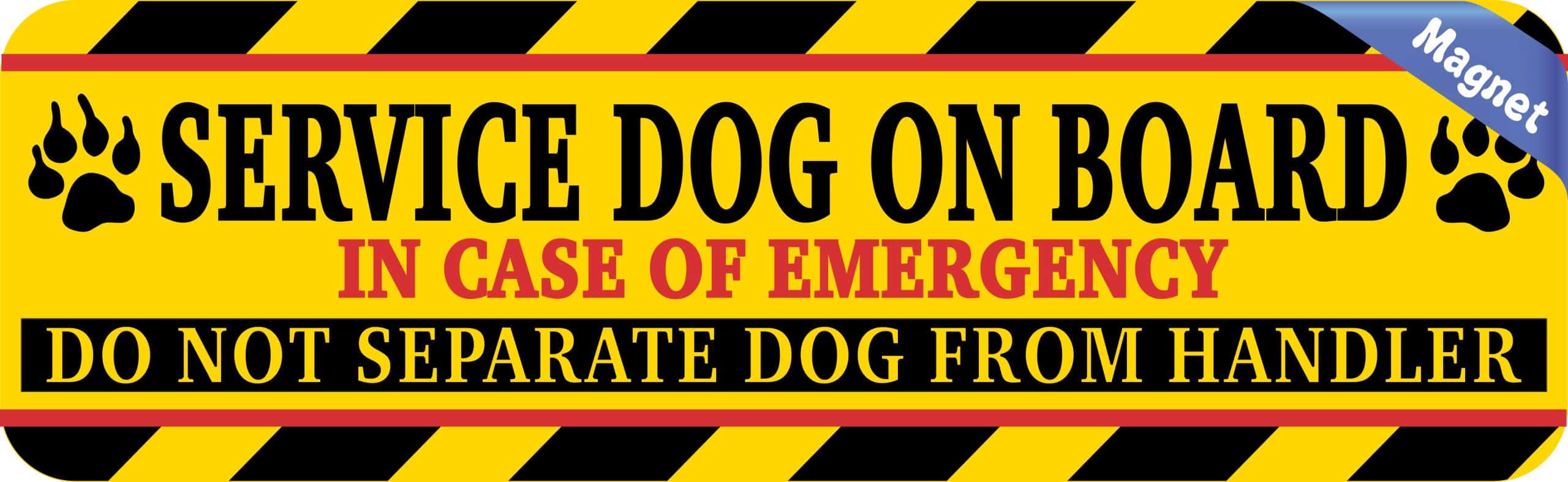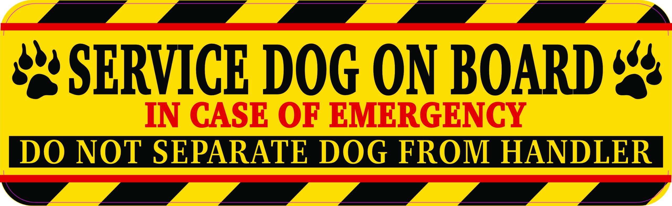 This service dog alert magnet measures 10 inches wide by 3 inches tall. The bright yellow magnetic sign features bold black text reading ‘SERVICE DOG ON BOARD’ with ‘IN CASE OF EMERGENCY DO NOT SEPARATE DOG FROM HANDLER’ prominently displayed. The eye-catching design includes black and yellow diagonal warning stripes at the top and bottom borders, along with paw print graphics flanking the main text. This essential safety magnet alerts emergency responders, law enforcement, and first responders that a service dog should remain with their handler during emergencies or accidents. The high-visibility yellow background and professional warning stripe design ensures maximum visibility and recognition. Perfect for service dog handlers who travel by car, truck, or other vehicles.