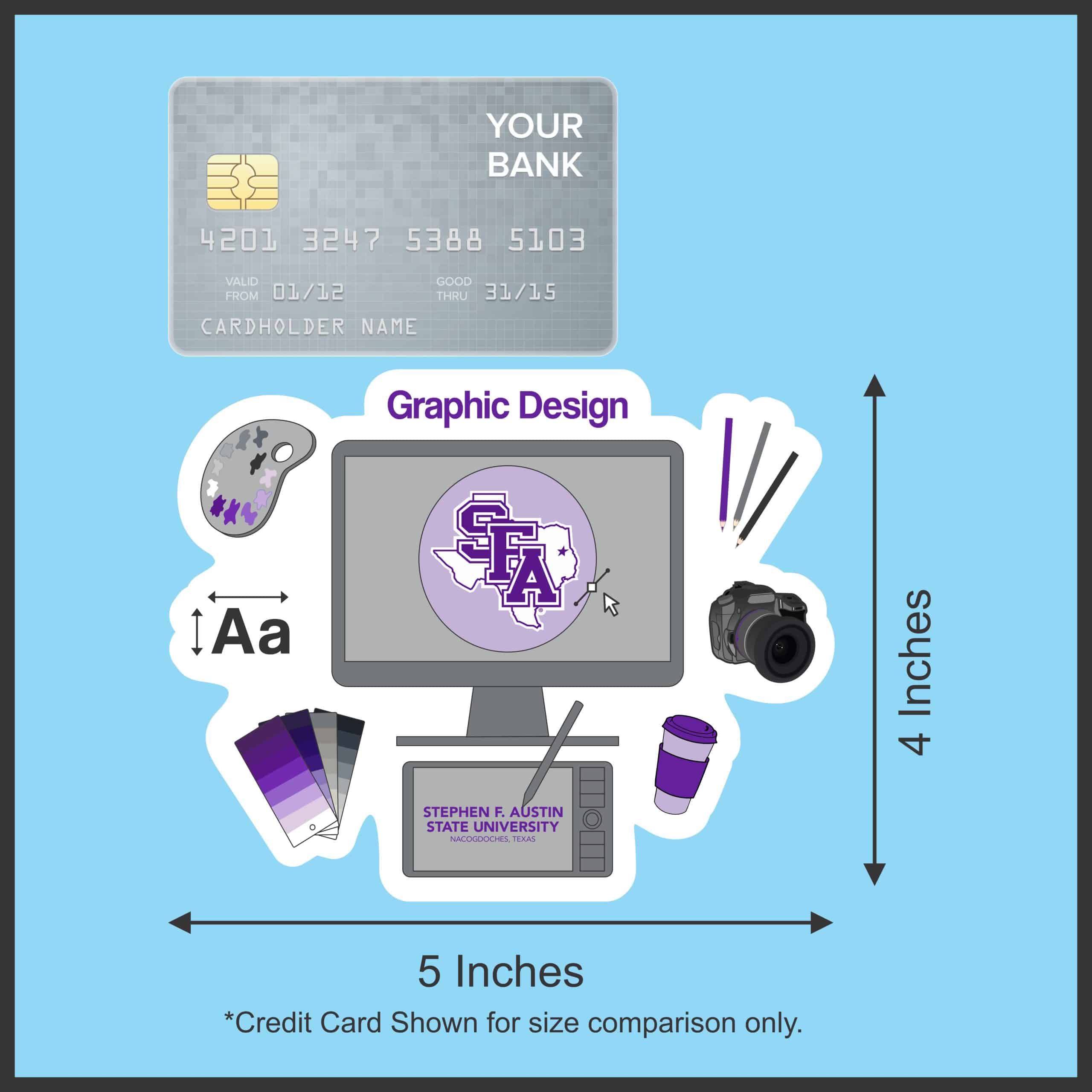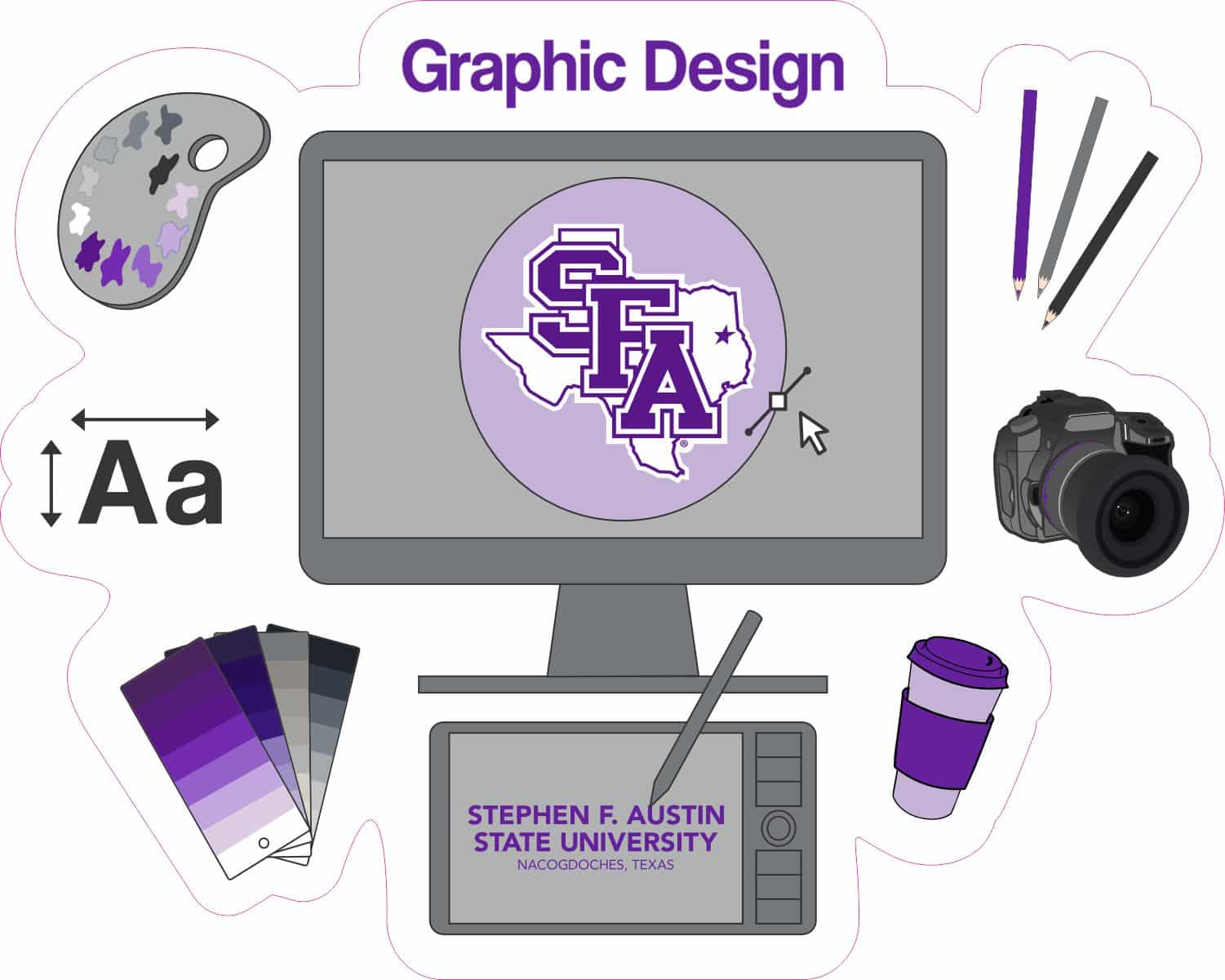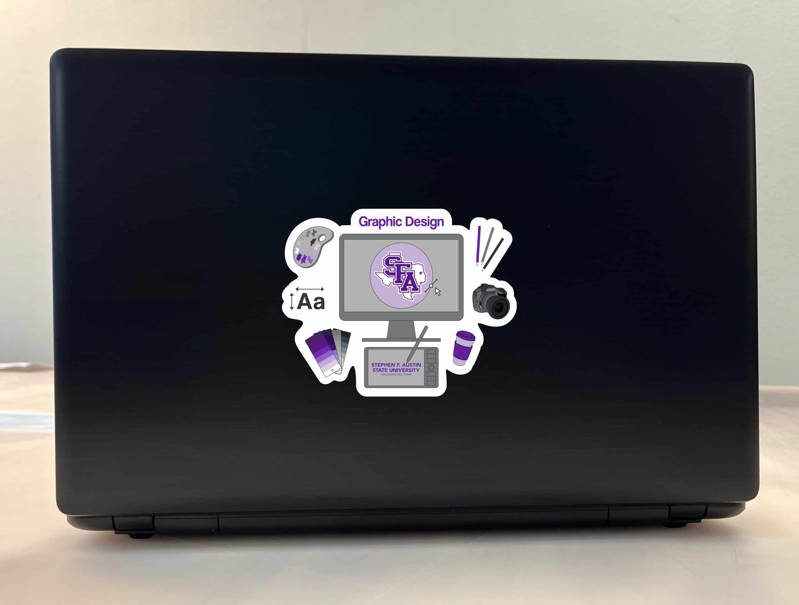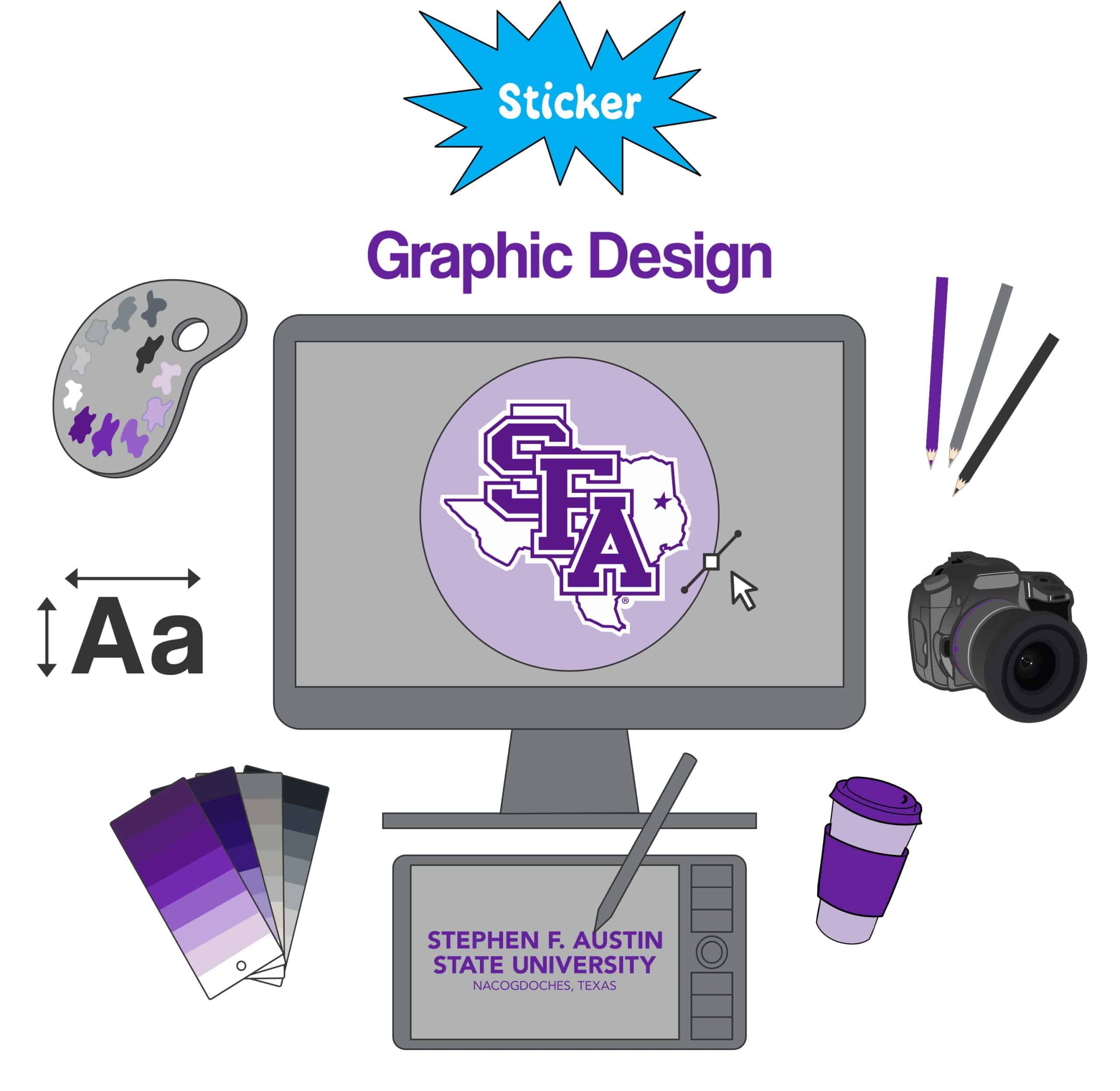 This sticker measures 5 inches wide by 4 inches tall. It has been officially licensed by Stephen F. Austin State University. This is a graphic design sticker with the words, Graphic Design, at the top of the sticker in purple. In the middle of the sticker is a computer monitor with the university’s logo. Surrounding it are representations of various graphic design related images. Including a tablet that says, STEPHEN F. AUSTIN STATE UNIVERSITY NACOGDOCHES, TEXAS, in a purple font. This sticker is a great way to show your pride in being a lumberjack and a graphic design major. This sticker can be applied to any flat smooth surface. The pink line indicates where the sticker will be cut and will not be printed on the final product.