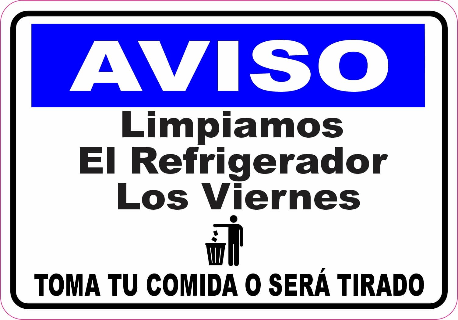 This magnet measures 5 inches wide by 3.5 inches tall. It is the Spanish equivalent of our Friday is Clean the Fridge Day magnet. On a white background are the words AVISO Limpiamos el Refrigerador Los Viernes Toma Tu Comida O Será Tirado in black letters. This is a great way to remind your Spanish speaking employees that the fridge will be cleaned on Friday and they if they want to keep anything, they should take it with them. The pink line indicates where the magnet will be cut and will not be printed on the final product.