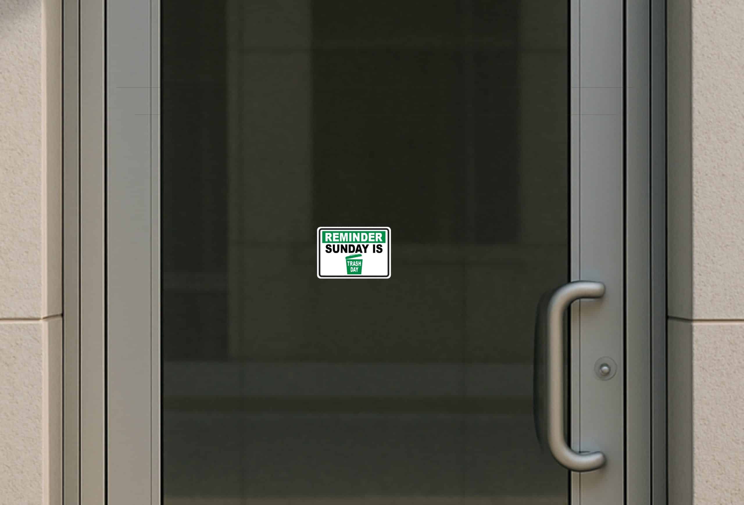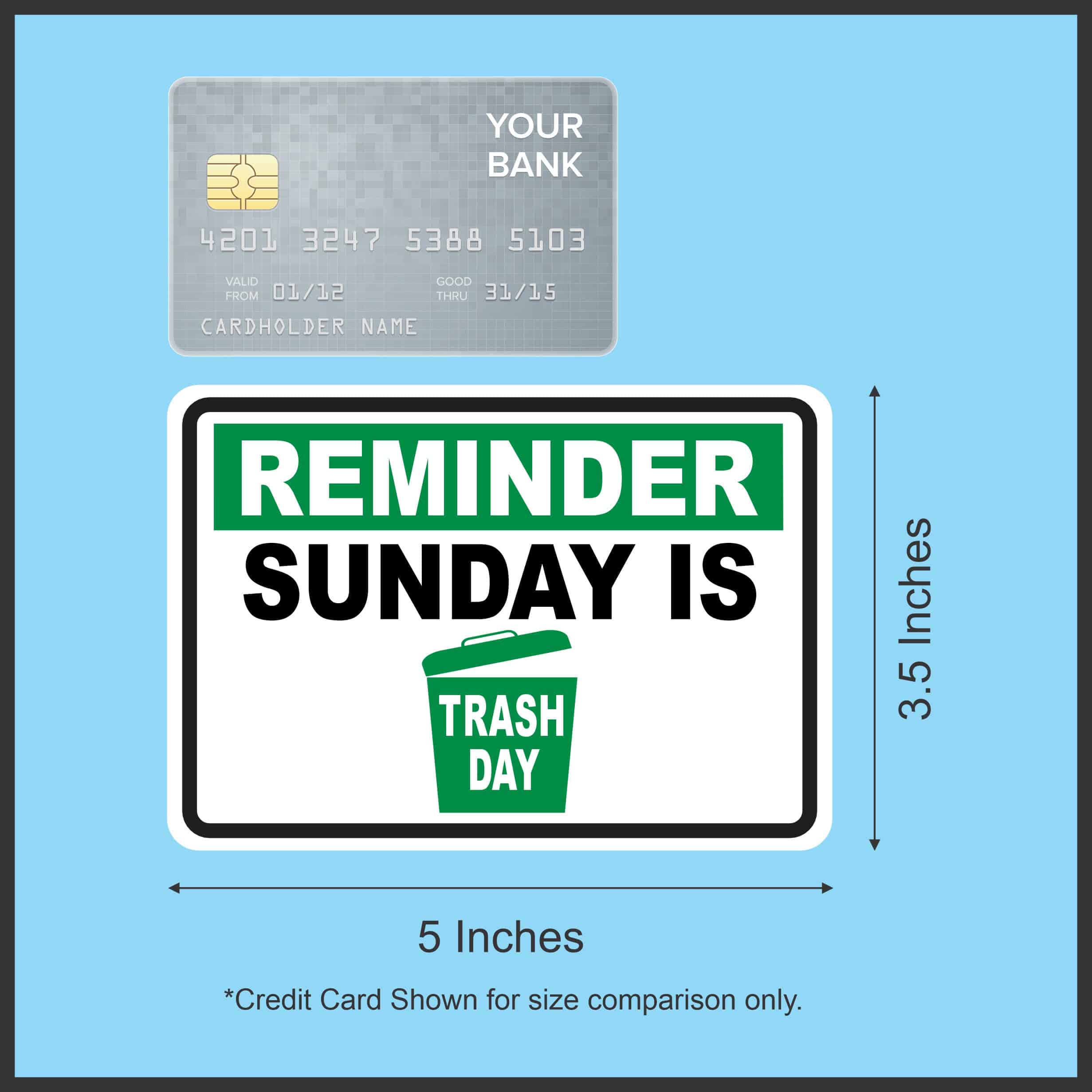 This sticker measures 5 inches wide by 3.5 inches tall (127 mm x 88.9 mm). Never miss trash day again with this eye-catching reminder sticker featuring bold green and white text with a trash can graphic. The design prominently displays “REMINDER” in white text on a green banner, followed by “SUNDAY IS” in black letters, and includes a green trash can icon labeled “TRASH DAY” to ensure clear communication. Made from high-quality air release vinyl with removable adhesive, this sticker can be easily applied to various surfaces including mailboxes, garage doors, kitchen areas, or anywhere you need a visual reminder. The weatherproof construction features UV resistant PVC lamination that resists fading and cracking, making it suitable for both indoor and outdoor use. The waterproof design ensures durability in all weather conditions. This practical organizational tool helps maintain household schedules and prevents missed pickup days. The vibrant green color scheme provides excellent visibility while the clear typography ensures readability from a distance. Made in the USA with premium materials for long-lasting performance. While easily removable, this is a one-time use product designed for permanent placement once applied.