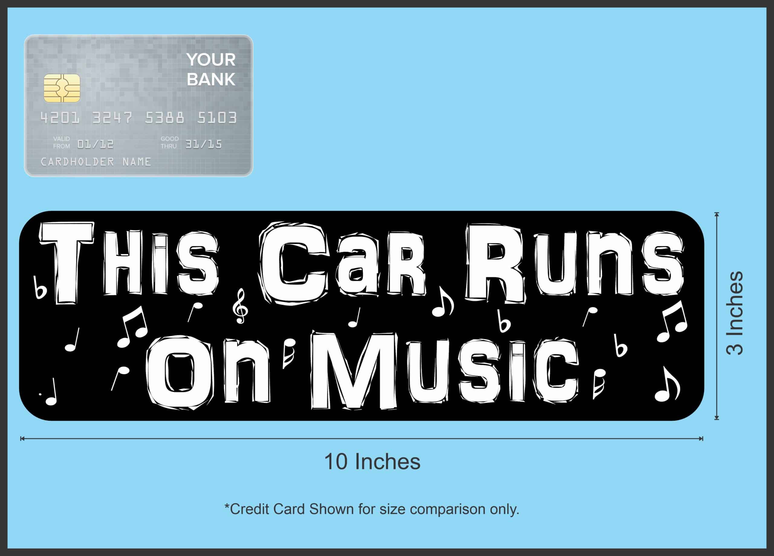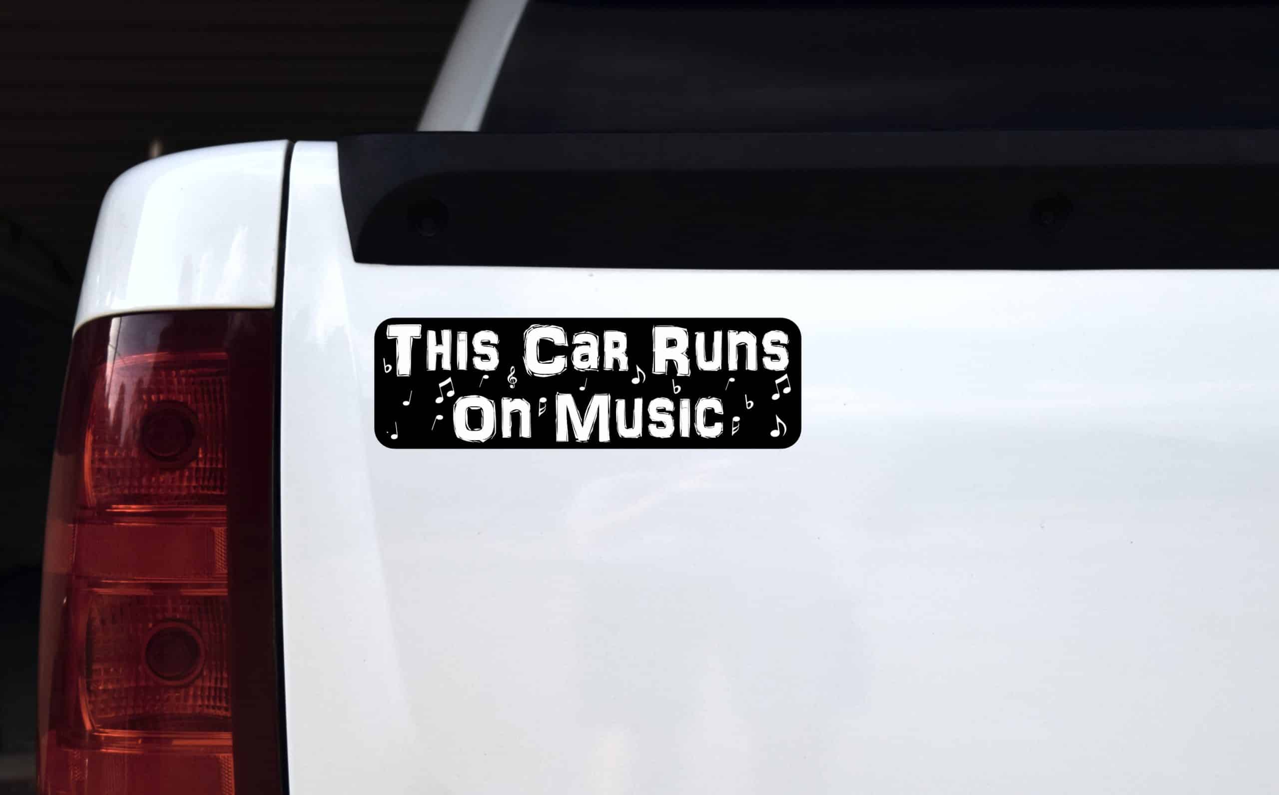 This magnet measures 10 inches wide by 3 inches tall (254.0 mm x 76.2 mm). Show your love for music with this eye-catching “This Car Runs on Music” vinyl magnet featuring bold white lettering on a sleek black background. Decorated with musical notes and symbols throughout the design, this magnet is perfect for music lovers, musicians, DJs, and anyone who lives and breathes music.