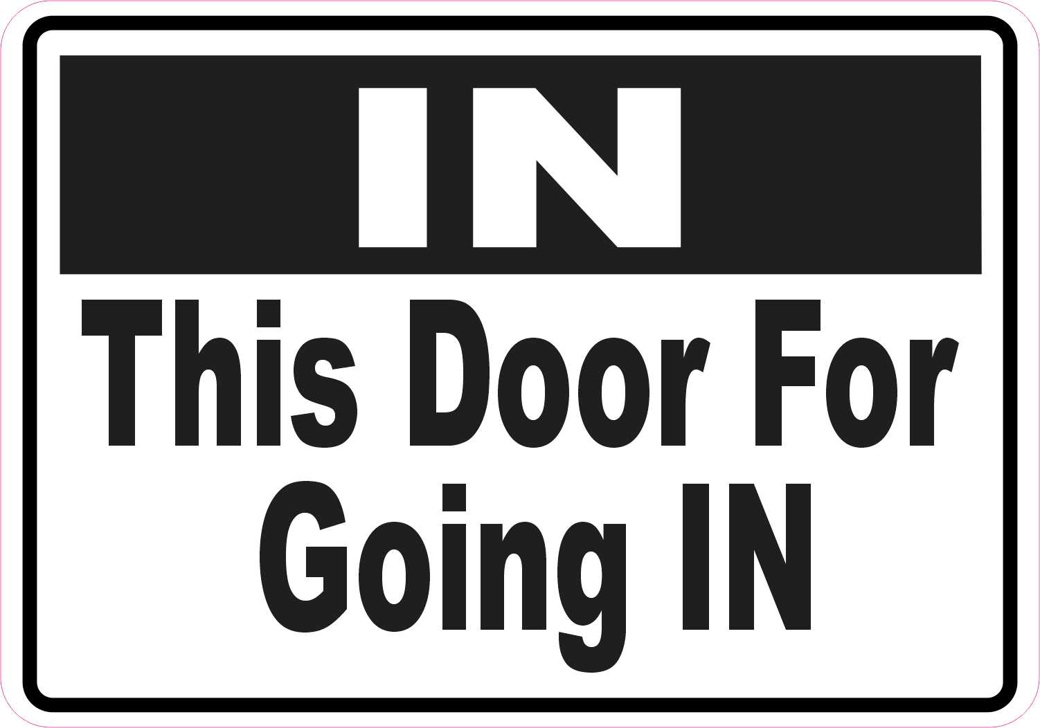 The magnet is 5 inches wide by 3.5 inches tall when applied. The word, IN, is printed at the top in white letters on a black rectangle. Below the rectangle, the phrase, This Door For Going IN, is printed in black letters on a white background. A black border accents the magnet’s edges. The pink line in the image shows where the magnet is cut; the pink line is not printed on the magnet. This quality-made product is durable and easily visible, making it ideal for use in a variety of settings and scenarios! However, it only attracts ferromagnetic metals.