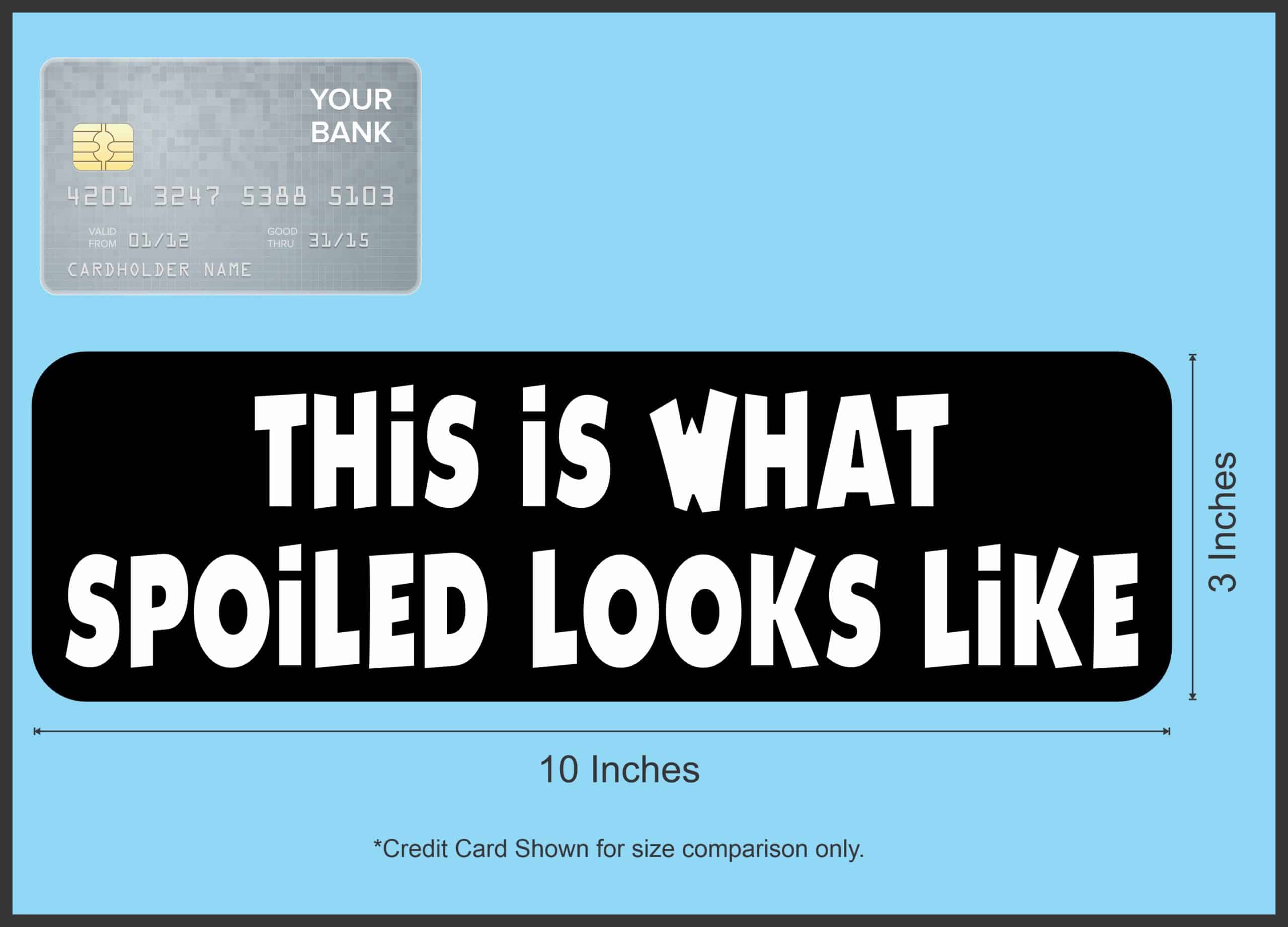 This magnet is 10 inches wide by 3 inches tall when applied. It features the words, THIS IS WHAT SPOILED LOOKS LIKE, in white letters on a black background. This carefully crafted product is a witty way to add some personality to your vehicle, tablet, laptop, or other hard, flat surfaces! However, it only attracts ferromagnetic metals.