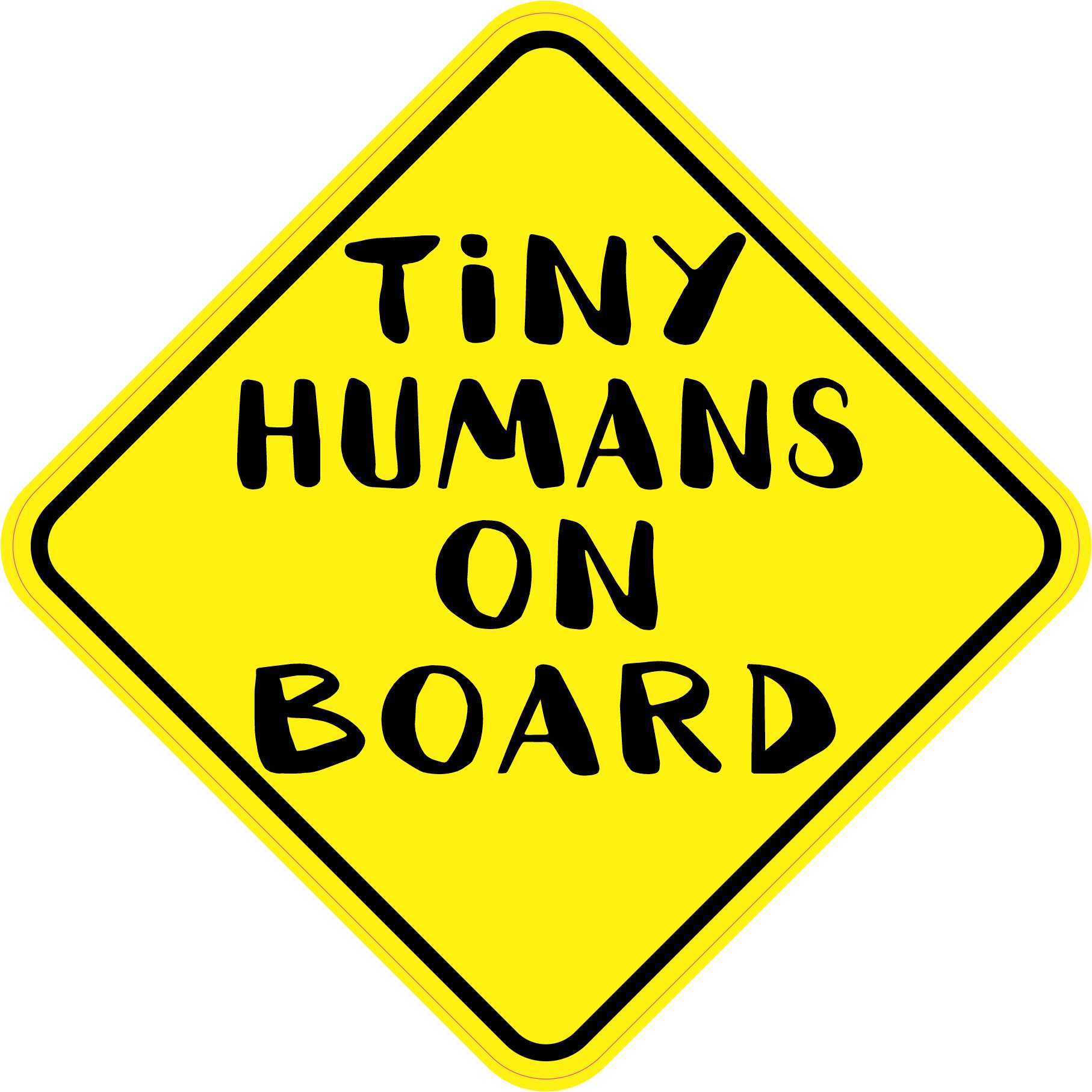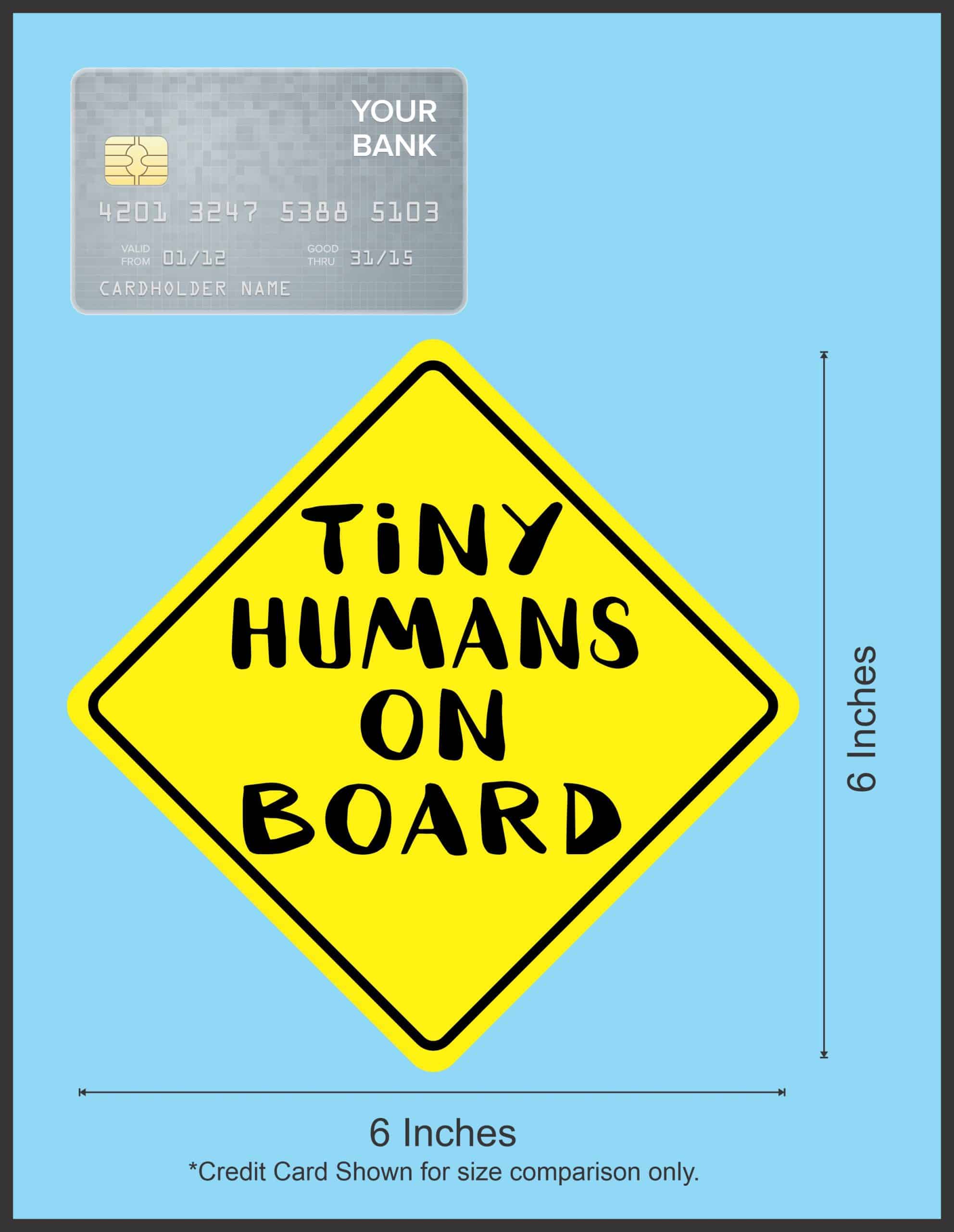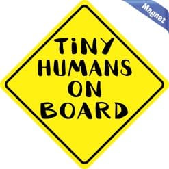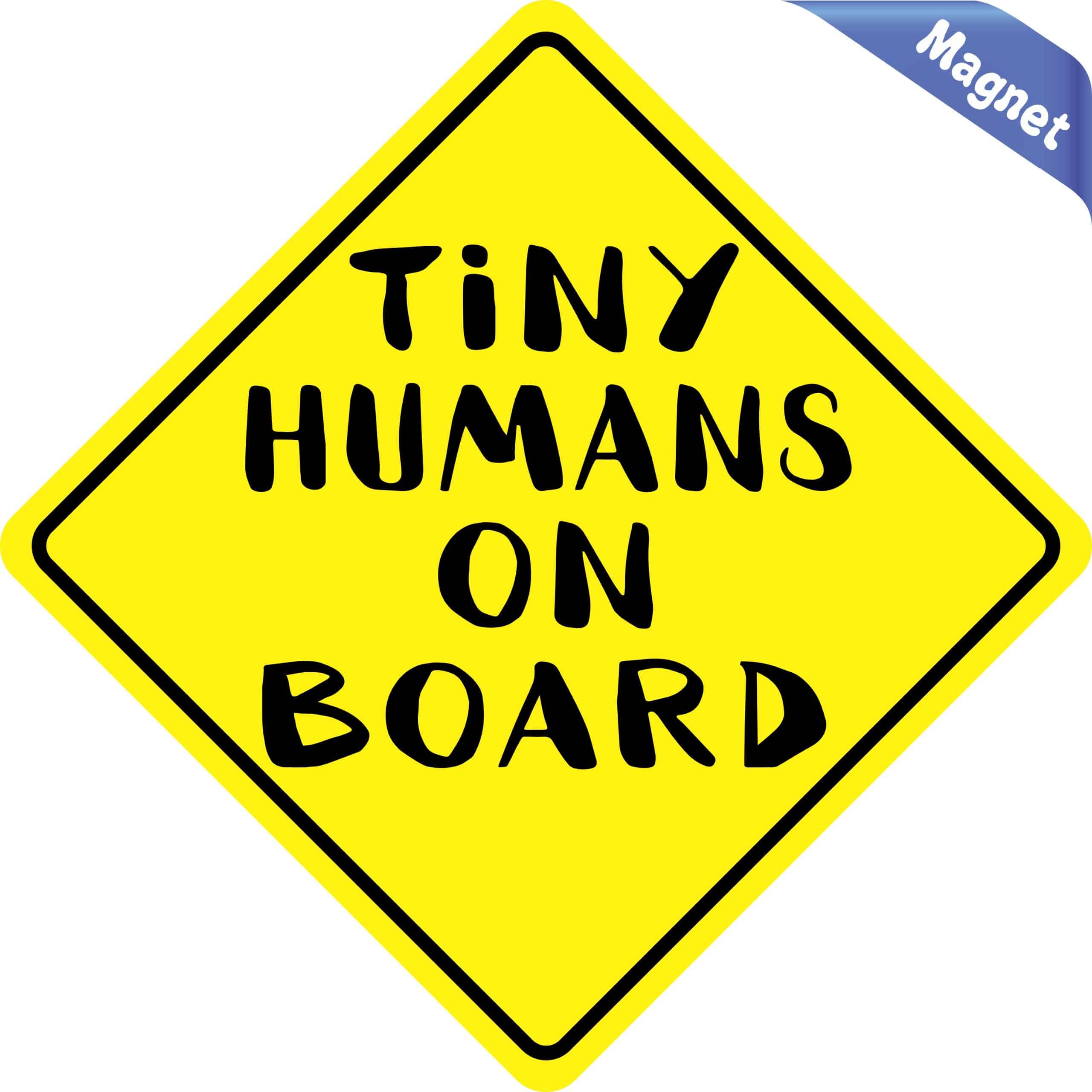 This diamond-shaped magnet is 6 inches wide by 6 inches tall when applied. It features the words, TINY HUMANS ON BOARD, in black letters on a yellow background. A black border decorates the edges of the magnet. This quality-made product is a witty way to keep your little ones safe on the road! However, it only attracts ferromagnetic metals.