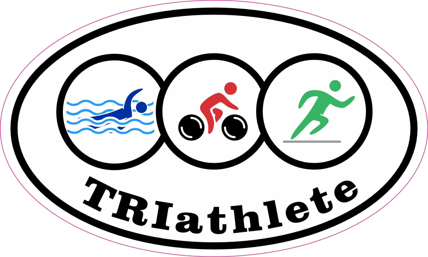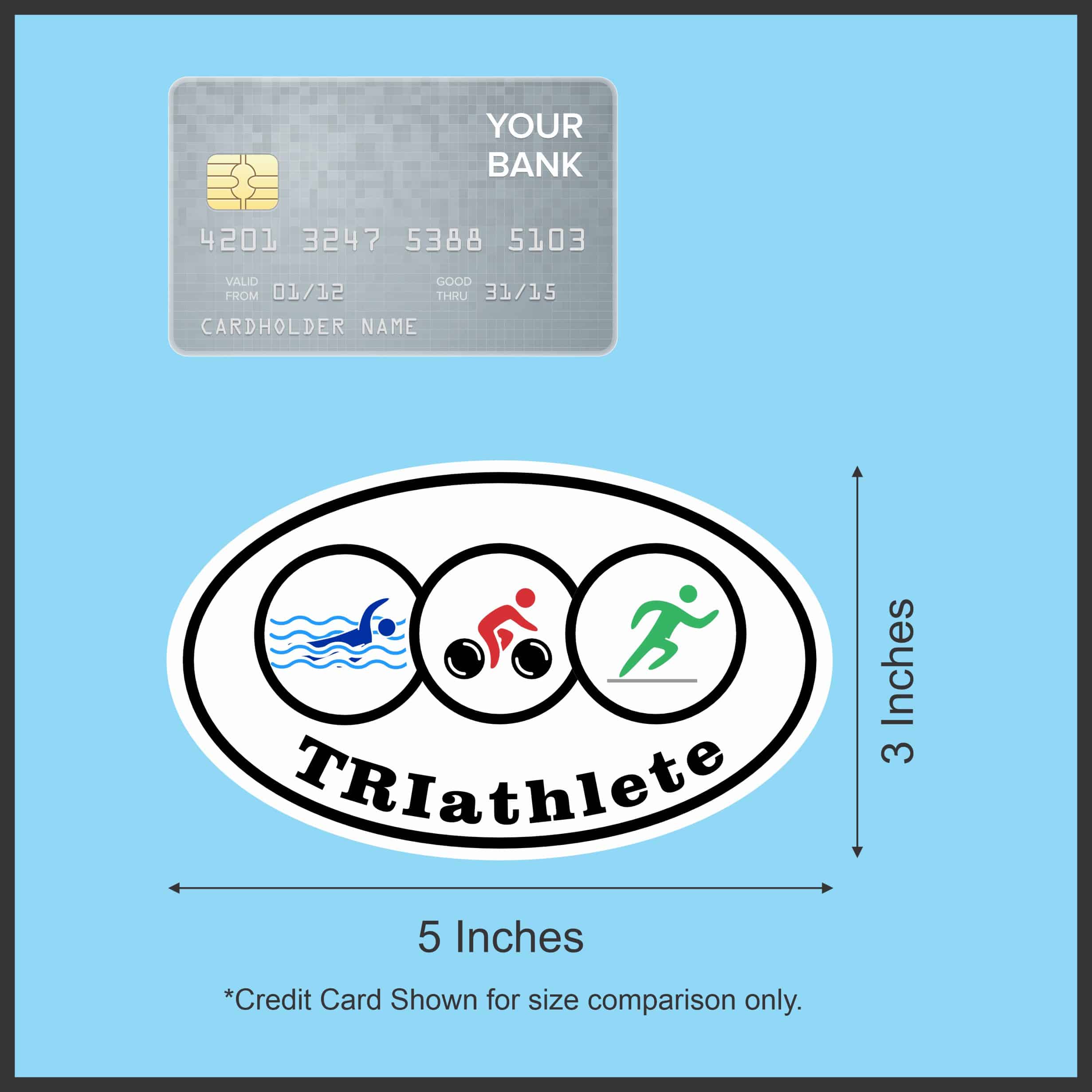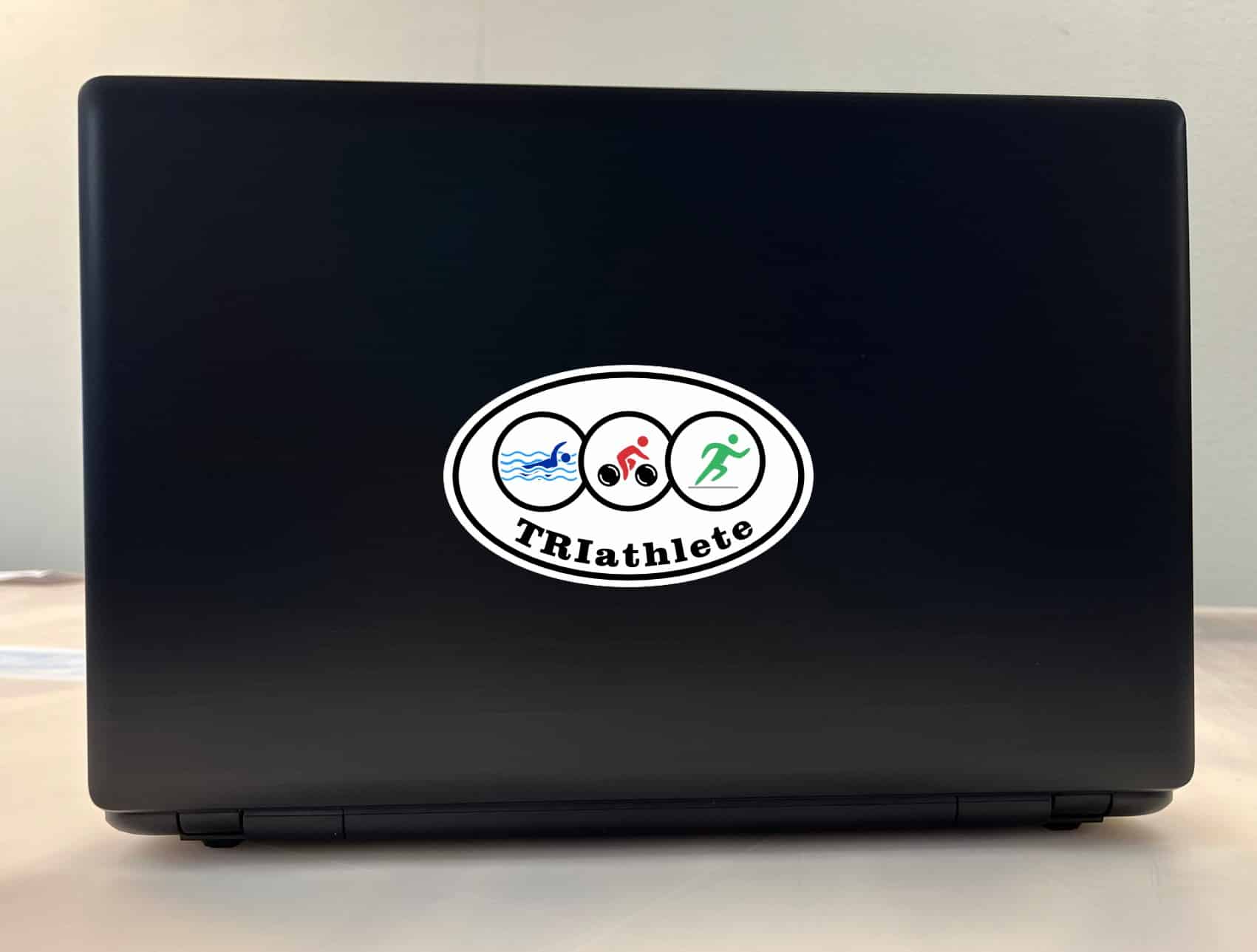 This sticker measures 5 inches wide and 3 inches tall. It is a white oval with a black border. At the bottom of the sticker, it says “TRIathlete.” Above that there are icons of a person swimming, riding a bicycle, and running. This sticker is perfect for triathlon athletes. It looks beautiful when applied to a flat smooth surface.
