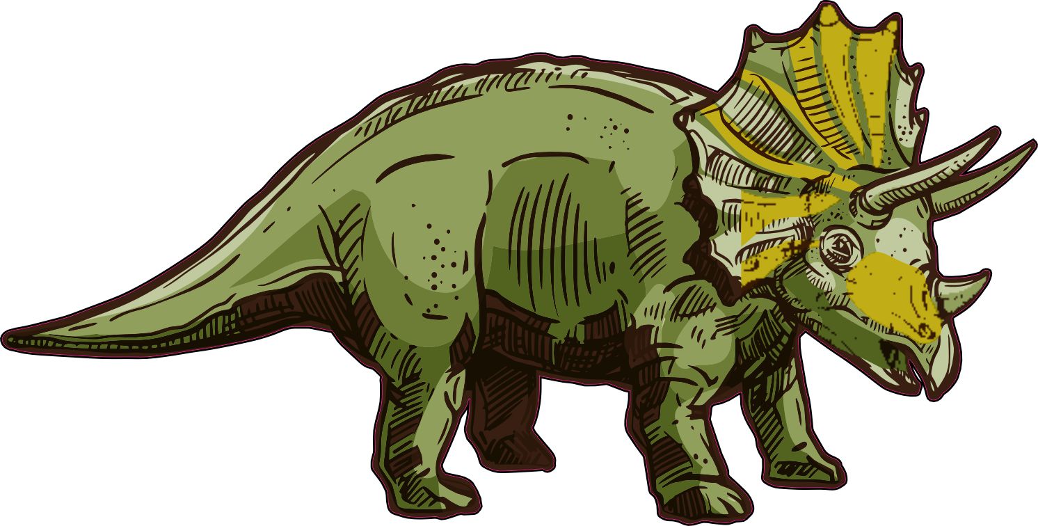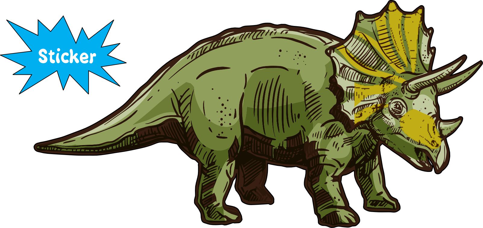 This sticker measures 5 inches wide and 2.5 inches tall. This Triceratops sticker is green with shading in browns and yellow created with a fun sketch art style. It’s perfect for any dinosaur enthusiast. The sticker will look best when applied to a flat smooth surface. The pink line indicates where the sticker will be cut and will not be printed on the final product.