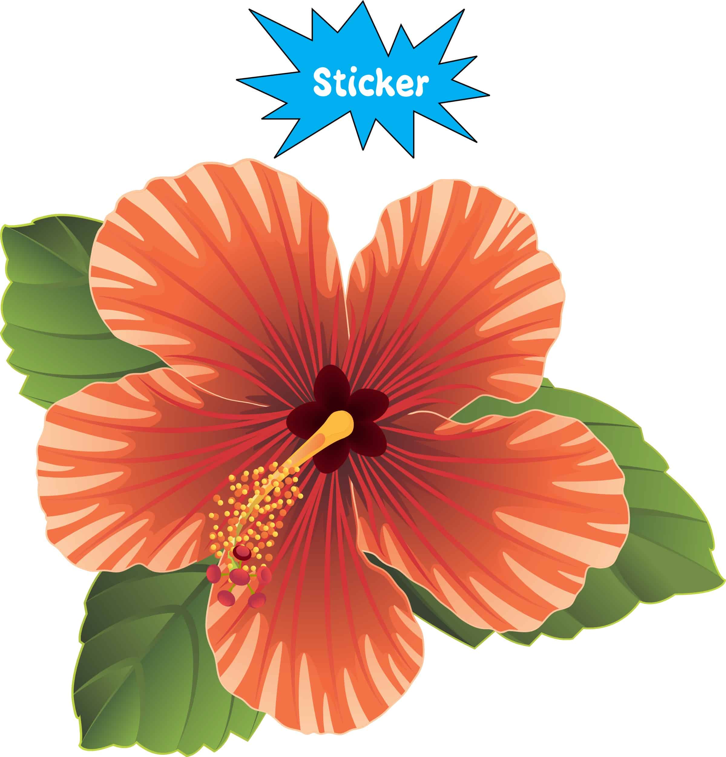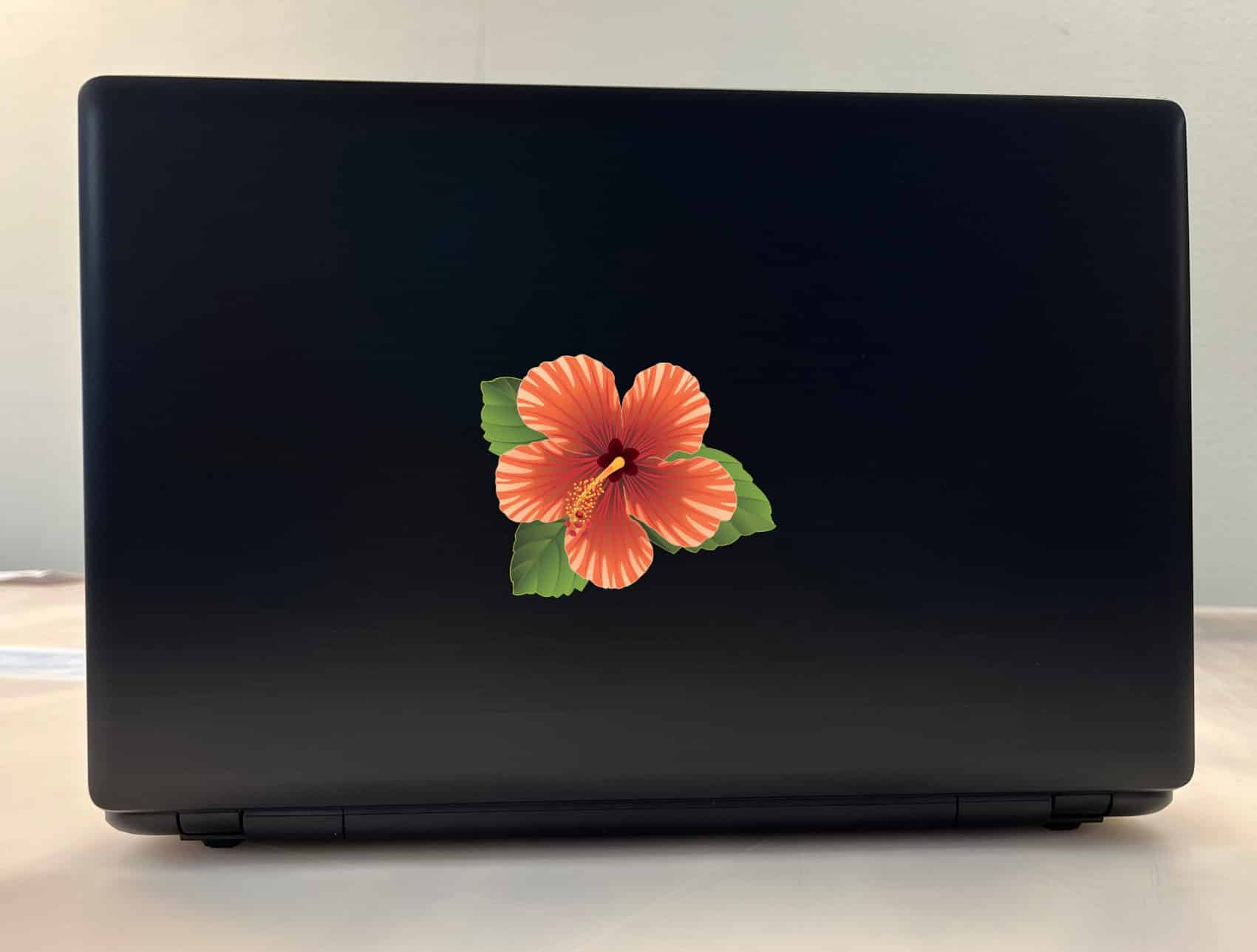 This sticker measures 4 inches wide by 3.3 inches tall. Transform any surface with this stunning tropical hibiscus flower vinyl sticker featuring vibrant orange and coral petals with intricate radiating patterns. The design showcases authentic botanical details including a prominent yellow stamen with pollen and lush green foliage. This hibiscus sticker brings a touch of paradise to laptops, water bottles, car windows, phone cases, and more. Whether you’re decorating personal items or adding tropical flair to your space, this beautiful hibiscus design captures the essence of exotic island beauty.