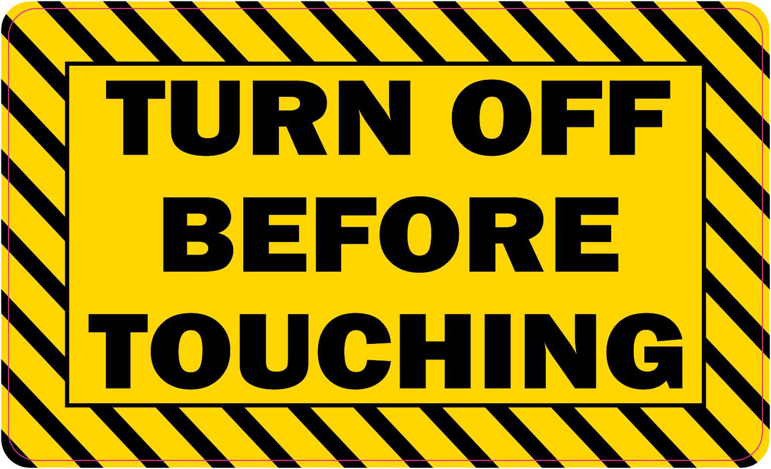 This magnet is 5 inches wide by 3 inches tall when applied.  The words, TURN OFF BEFORE TOUCHING, appear in black letters on a yellow background with a thin, black border.  The perimeter of the magnet is bordered in yellow and black, diagonal stripes.  This quality-made product is a great way to maintain a safe environment!  However, it only attracts ferromagnetic metals.