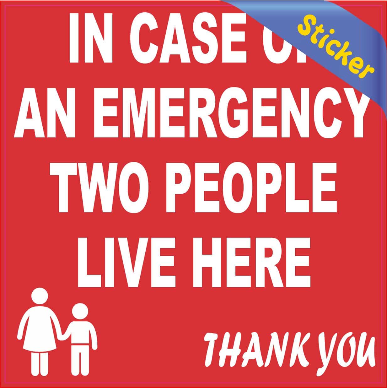 This sticker measures 4 inches wide and 4 inches tall. It has a red background and white text that says, IN CASE OF AN EMERGENCY TWO PEOPLE LIVE HERE THANK YOU. At the bottom left corner there is an icon of a mother and her child. This sticker is great at alerting emergency responders of the amount of people that occupy the home. This ensures that no one gets left behind. This sticker works best when applied to a flat smooth surface. The pink line indicates where the sticker will be cut and will not be printed on the final product.