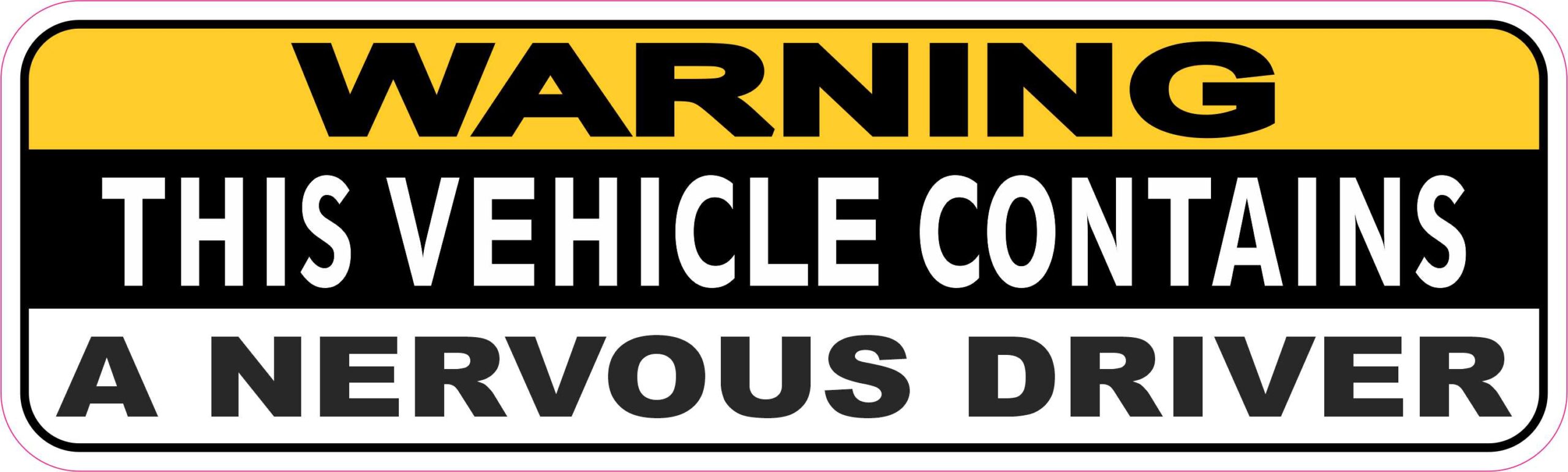 This magnet is 10 inches wide by 3 inches tall when applied.  The word, WARNING, is printed at the top of the magnet in black letters on a yellow strip of background.  Below, the words, THIS VEHICLE CONTAINS, are printed in white letters on a black section of background, and the words, A NERVOUS DRIVER, are printed in black letters on a white portion of background near the bottom of the magnet.  The magnet’s edges are decorated with a black border.  A small, white margin will remain on the outside edges of the magnet after application.  The pink line in the image shows where the magnet is cut.  However, the pink line is not printed on the magnet.  This carefully crafted product is durable and easily visible, making it a great way to promote safety on the road!  However, it only attracts ferromagnetic metals.
