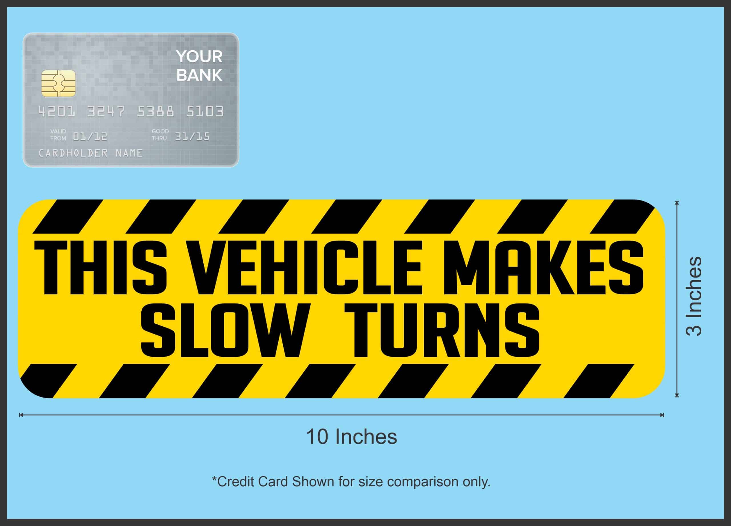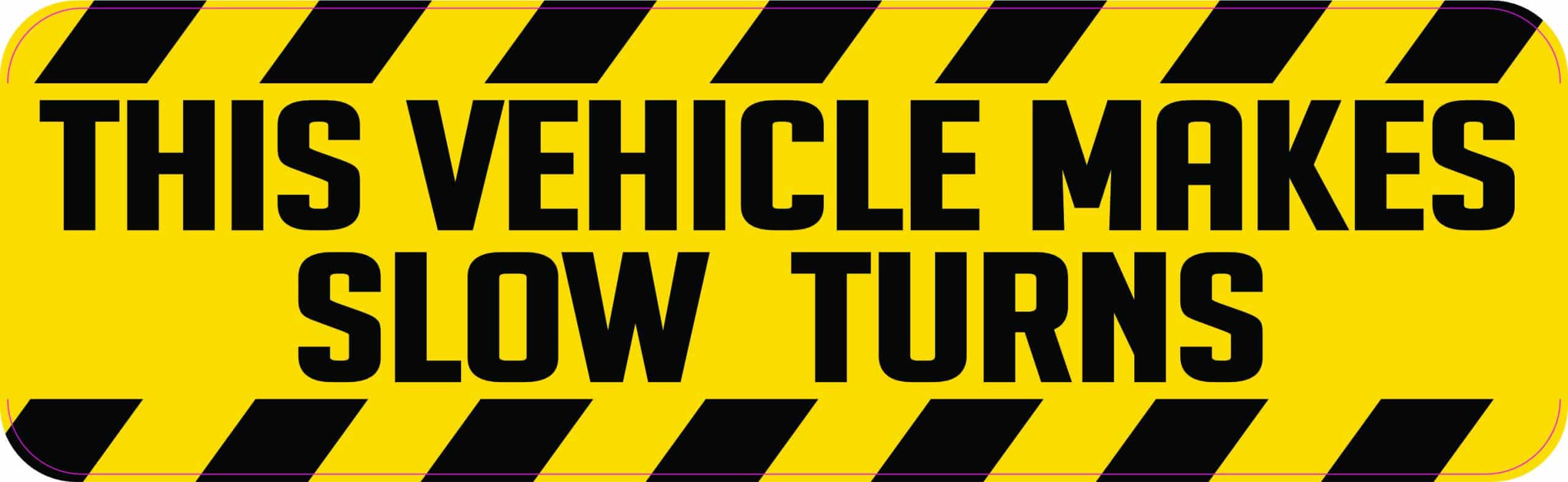 This sticker measures 10 inches wide and 3 inches tall. It has a yellow background with black caution stripes on the top and bottom of the sticker. In the middle there is black text that reads, THIS VEHICLE MAKES SLOW TURNS. It is great for warning other drivers on the roadway to use caution around this vehicle. It looks best when applied to a flat smooth surface. The pink line indicates where the sticker will be cut and will not be printed on the final product.
