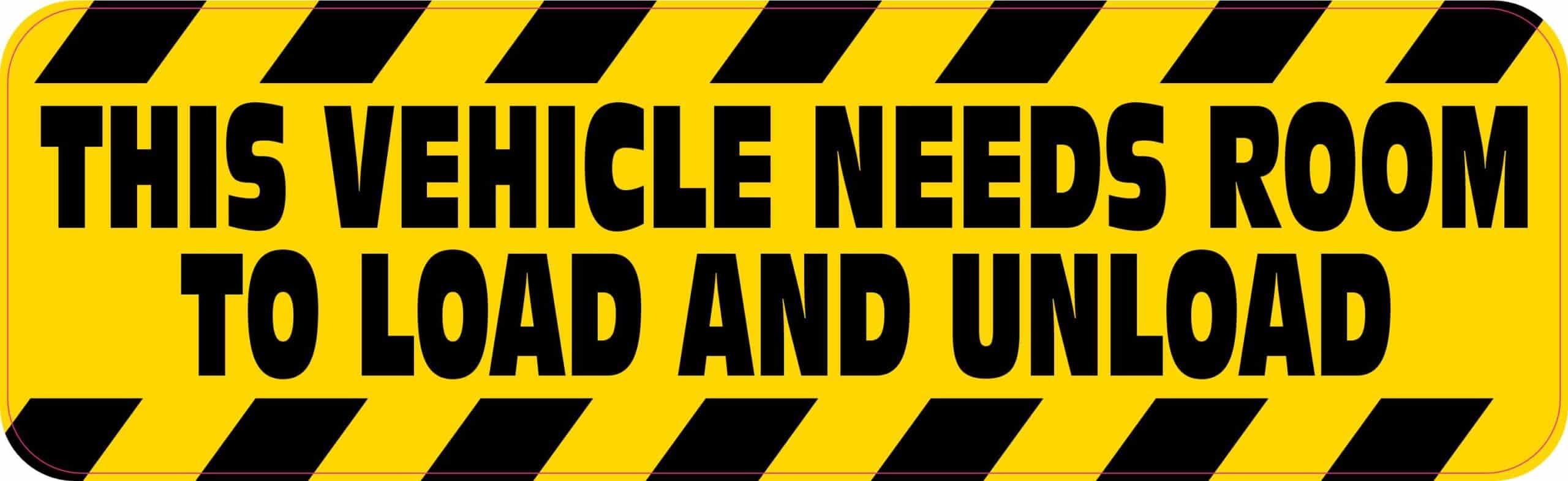 This magnet is 10 inches wide by 3 inches tall when applied. It features the words, THIS VEHICLE NEEDS ROOM TO LOAD AND UNLOAD, in black letters on a yellow background. Black, diagonal stripes accent the top and bottom borders of the magnet. This carefully crafted product is durable and easily visible, making it a helpful reminder for other drivers in the parking lot! However, it only attracts ferromagnetic metals.
