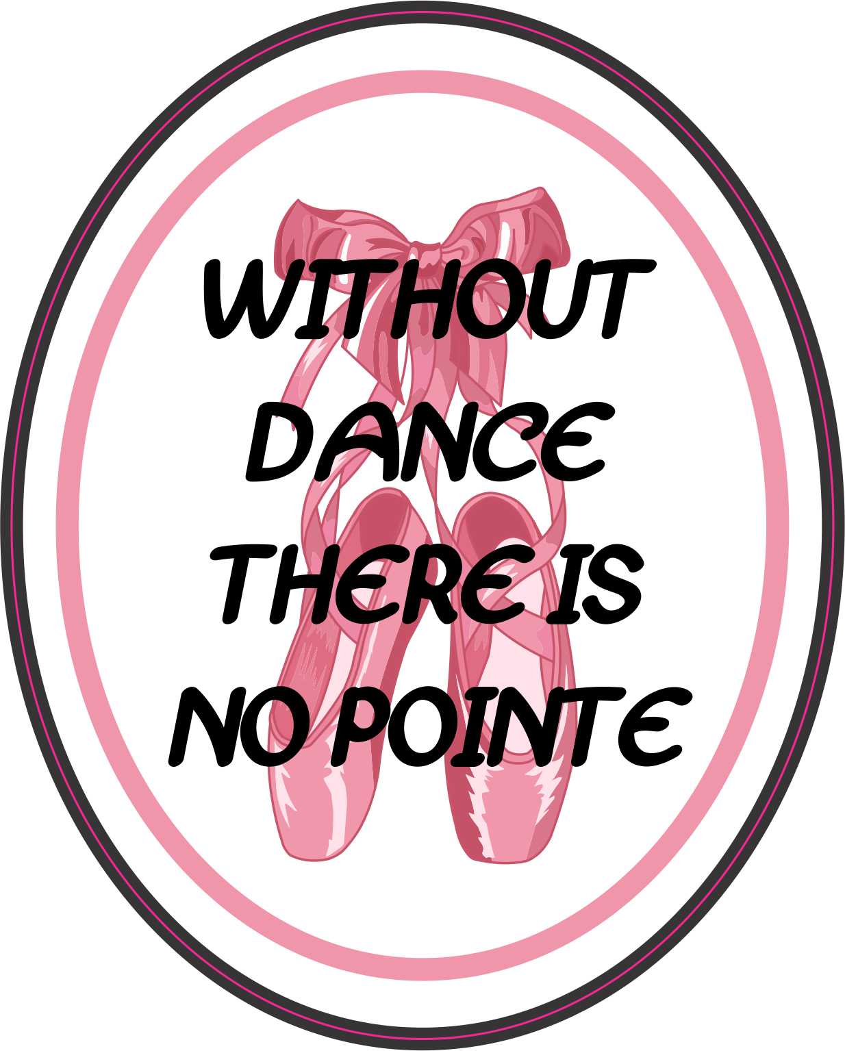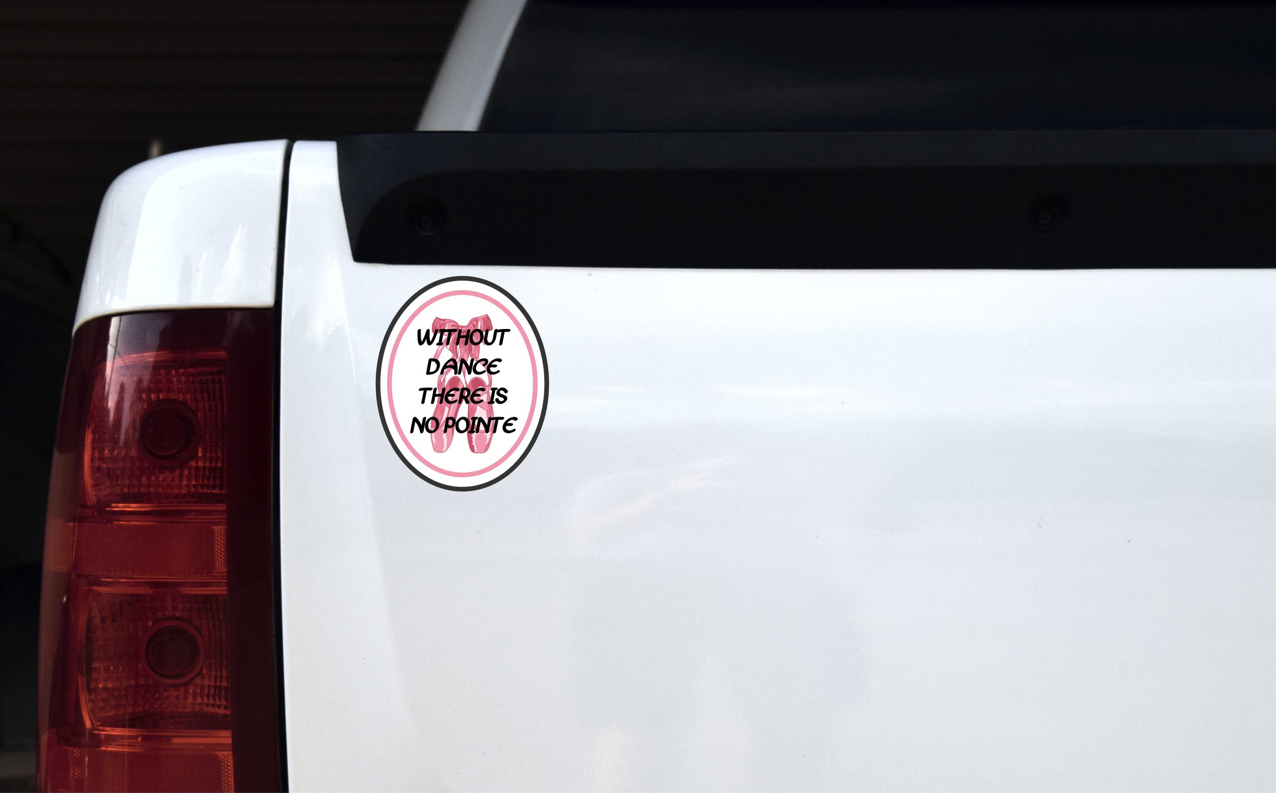 This elliptically-shaped sticker is 4 inches wide by 5 inches tall when applied. It features the words, WITHOUT DANCE THERE IS NO POINTE, in black letters. A picture of a pair of ballet pointe shoes are printed under the text. The sticker’s background is white with pink and black concentric borders. This carefully crafted product is a witty way to share your love for dance!