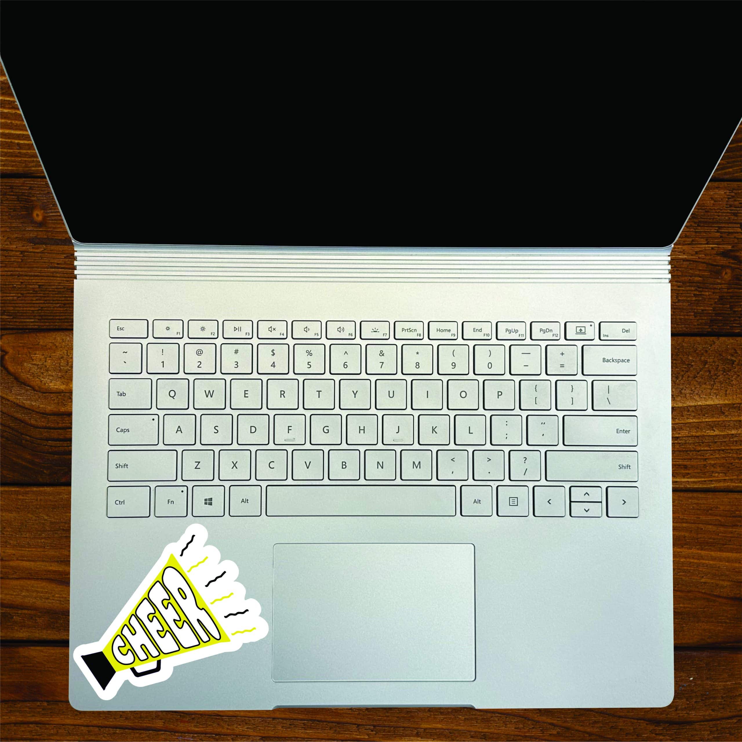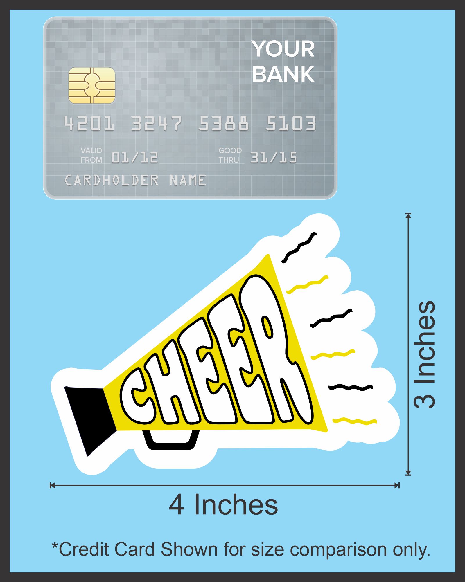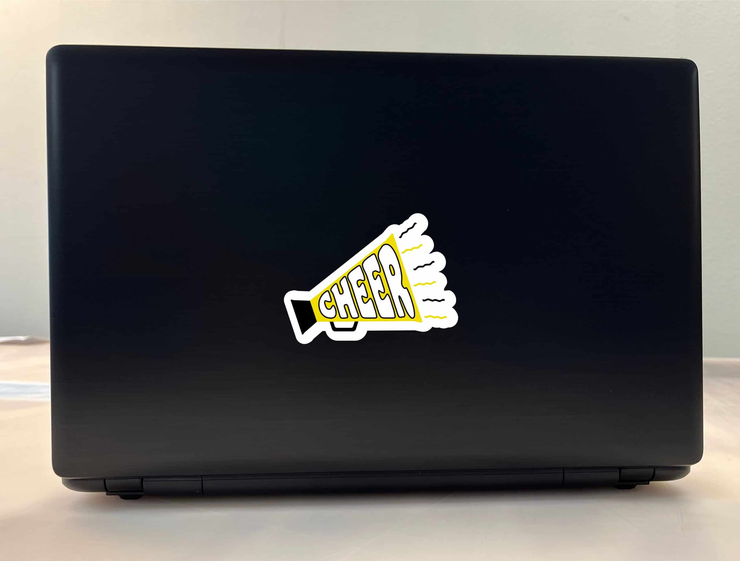 4 inches by 3 inches (101.6 mm x 76.2 mm) Yellow and Black Cheer Megaphone Vinyl Sticker