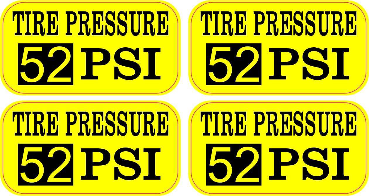 This product contains four stickers. Each sticker is 2 inches wide by 1 inch tall when applied and features the words, TIRE PRESSURE 52 PSI. The number, 52, is printed in yellow letters on a black square, and the remainder of the text is printed in black letters on a yellow background. These carefully crafted products are durable and easily visible, making them ideal for use in shops and garages!