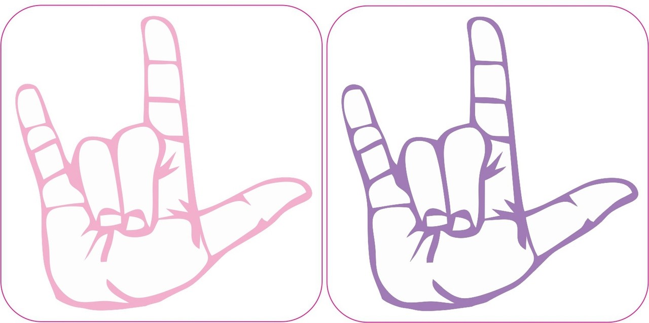 one sheet of 2, One pink and one purple; 2.5″ x 2.5″ ASL sign language I Love you Hand stickers. This is a special custom request from one of our customers. If you have a special request, let us know. We get some of our best ideas from our customers.